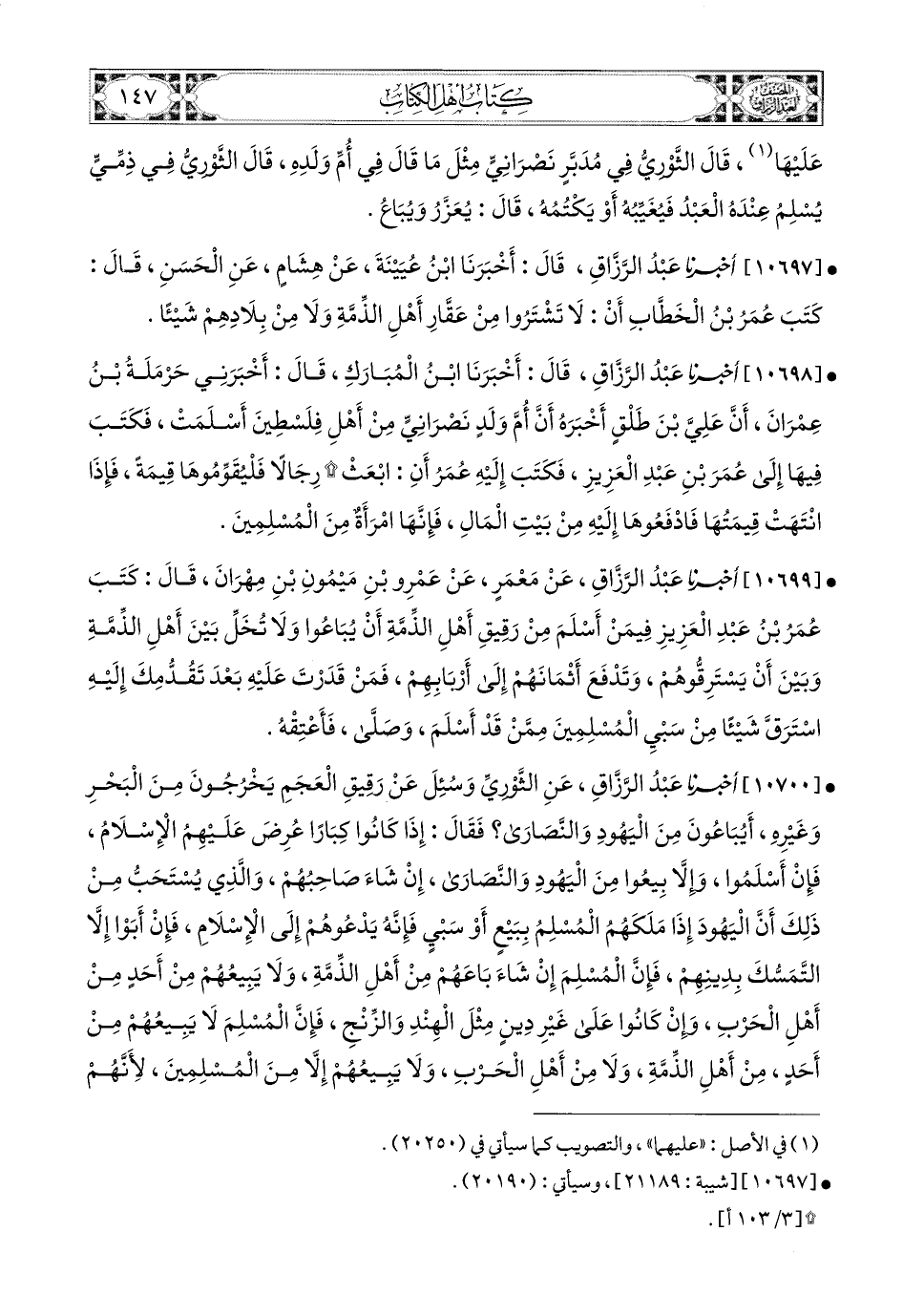 10699- أخبرنا عبد الرزاق، عَنْ مَعْمَرٍ، عَنْ عَمْرِو بنِ مَيْمُونِ بْنِ مِهْرَانَ، قَالَ: كَتَبَ عُمَرُ بن عَبدِ الْعَزِيزِ فِيمَنْ أَسْلَمَ مِنْ رَقِيقِ أَهْلِ الذِّمَّةِ أَنْ يُبَاعُوا وَلاَ تُخَلِّ بَيْنَ أَهْلِ الذِّمَّةِ وَبَيْنَ أَنْ يَسْتَرِقُّوهُمْ، وَتَدْفَعَ أَثْمَانَهُمْ إِلَى أَرْبَابِهِمْ، فَمَنْ قَدَرْتَ عَلَيْهِ بَعْدَ تَقُدُّمِكَ إِلَيْهِ اسْتَرَقَّ شَيْئًا مِنْ سَبْيِ المُسْلِمِينَ مِمَّنَ قَدْ أَسْلَمَ، وَصَلَّى، فَأَعْتِقْهُ.