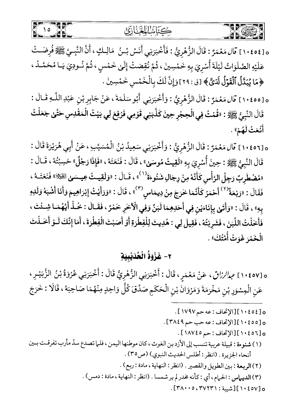 10457- عبد الرزاق، عَنْ مَعْمَرٍ، قَالَ: أَخْبَرَنِي الزُّهْرِيُّ، قَالَ: أَخْبَرَنِي عُرْوَةُ بن الزُّبَيْرِ، عَنِ المِسْوَرِ بْنِ مَخْرَمَةَ، وَمَرْوَانَ بْنِ الْحَكَمِ، صَدَّقَ كُلُّ وَاحِدٍ مِنْهُمَا صَاحِبَهُ، قَالاَ: خَرَجَ رَسُولُ اللهِ صَلَّى اللهُ عَلَيْهِ وَسَلَّمَ زَمَنَ الْحُدَيْبِيَةِ فِي بِضْعَ عَشْرَةَ مِئَةٍ مِنْ أَصْحَابِهِ، حَتَّى إِذَا كَانُوا بِذِي الْحُلَيْفَةِ، قَلَّدَ رَسُولُ اللهِ صَلَّى اللهُ عَلَيْهِ وَسَلَّمَ الْهَدْيَ وَأَشْعَرَهُ، وَأَحْرَمَ بِالْعُمْرَةِ، وَبَعَثَ بَيْنَ يَدَيْهِ عَيْنًا لَهُ مِنْ خُزَاعَةَ يُخْبِرُهُ عَن قُرَيْشٍ، وَسَارَ رَسُولُ اللهِ صَلَّى اللهُ عَلَيْهِ وَسَلَّمَ، حَتَّى إِذَا كَانُوا بِغَدِيرِ الأَشْطَاطِ، قَرِيبًا مِنْ عُسْفَانَ، أَتَاهُ عَيْنُهُ الْخُزَاعِيُّ، فَقَالَ: إِنِّي قَدْ تَرَكْتُ كَعْبَ بن لُؤَيٍّ، وَعَامِرَ بن لُؤَيٍّ قَدْ جَمَعُوا لَكَ الأَحَابِيشَ، وَجَمَعُوا لَكَ جُمُوعًا، وَهُمْ مُقَاتِلُوكَ وَصَادُّوكَ عَنِ الْبَيْتِ، فَقَالَ النَّبِيُّ صَلَّى اللهُ عَلَيْهِ وَسَلَّمَ: أَشِيرُوا عَلَيَّ، أَتَرَوْنَ لِي أَنْ نَمِيلَ إِلَى ذَرَارِيِّ هَؤُلاَءِ الَّذِينَ أَعَانُوهُمْ فَنُصِيبَهُمْ، فَإِنْ قَعَدُوا قَعَدُوا مَوْتُورِينَ مَحْرُوبِينَ،