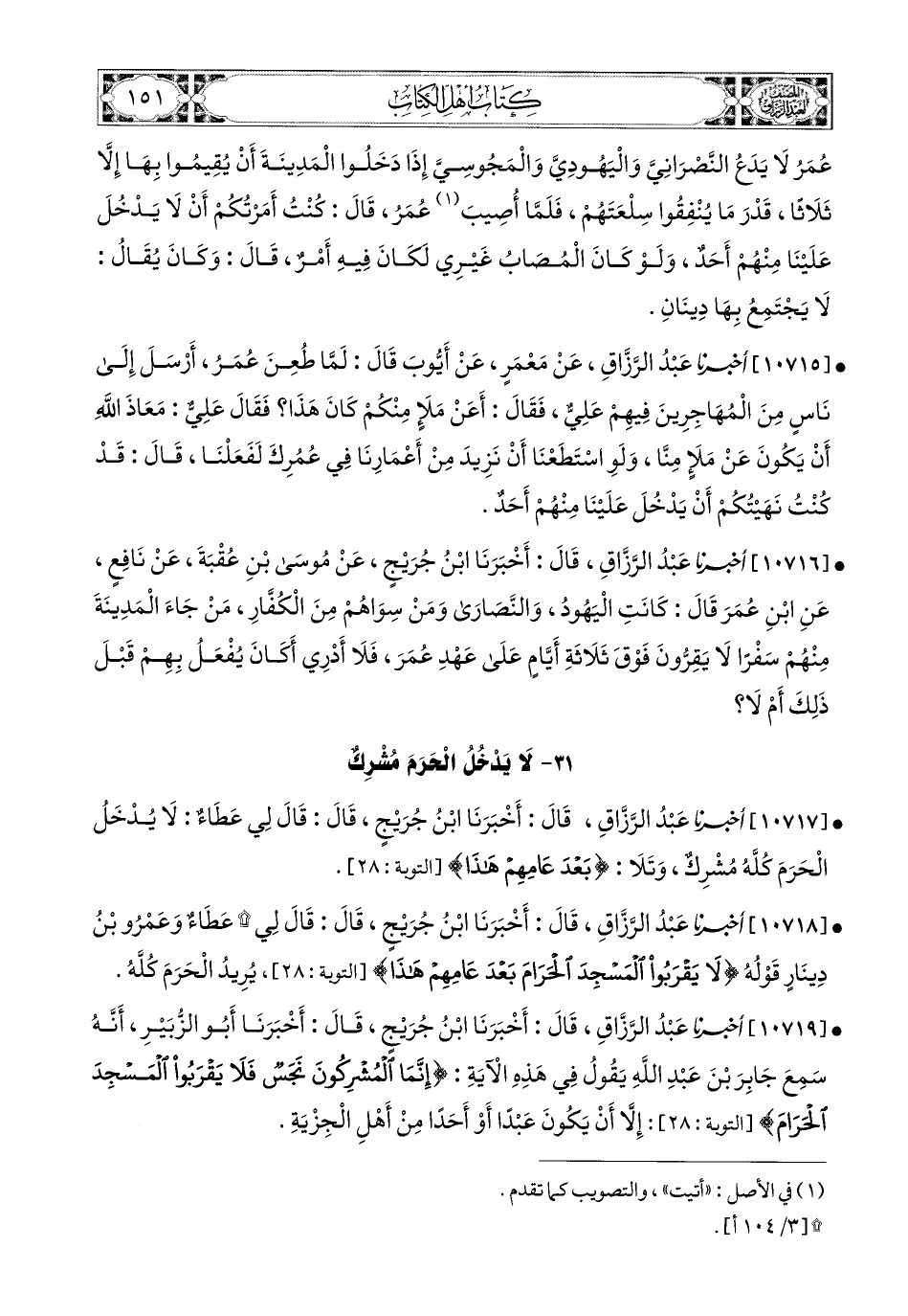 10717- أخبرنا عبد الرزاق، قال: أَخْبَرَنَا ابْنُ جُرَيْجٍ، قَالَ: قَالَ لِي عَطَاءٌ: لاَ يَدْخُلُ الْحَرَمَ كُلَّهُ مُشْرِكٌ، وَتَلاَ: {بَعْدَ عَامِهِمْ هَذَا}.