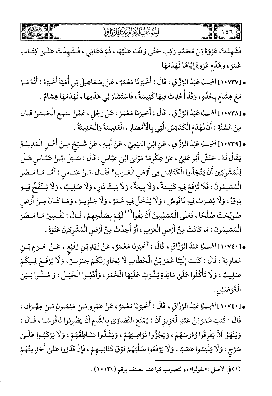 10738- أخبرنا عبد الرزاق، قال: أَخْبَرَنَا مَعْمَرٌ، عَن رَجُلٍ، عَمَّنَ سَمِعَ الْحَسَنَ قَالَ: مِنَ السُّنَّةِ أَنْ تُهْدَمَ الْكَنَائِسُ الَّتِي بِالأَمْصَارِ الْقَدِيمَةُ وَالْحَدِيثَةُ.