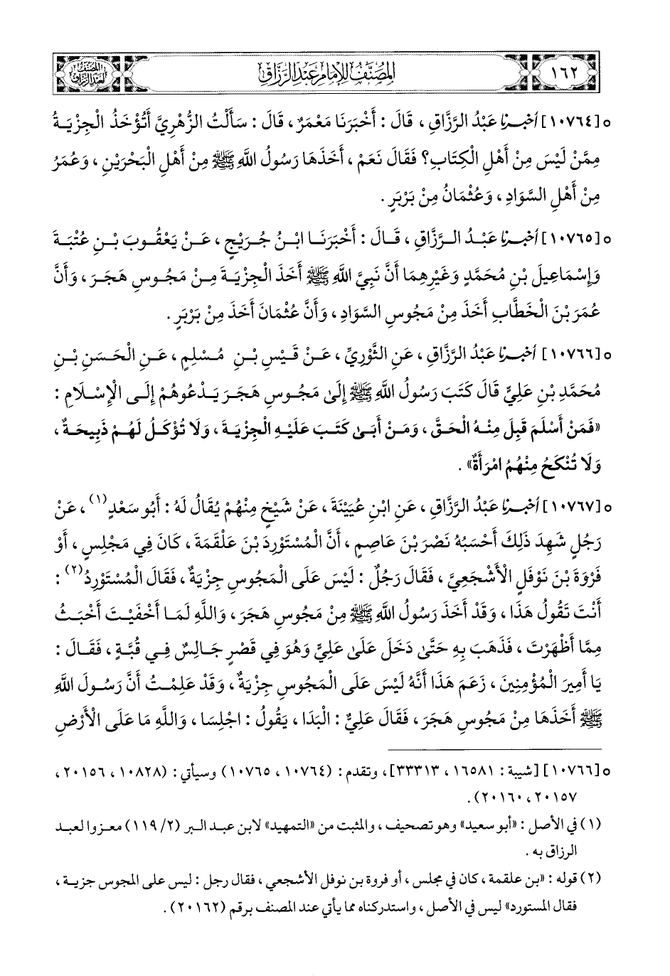 10765- أخبرنا عبد الرزاق، قال: أَخْبَرَنَا ابْنُ جُرَيْجٍ، عَن يَعْقُوبَ بْنِ عُتْبَةَ، وَإِسْمَاعِيلَ بْنِ مُحَمَّدٍ، وَغَيْرِهِمَا؛ أَنَّ نَبِيَّ اللهِ صَلَّى اللهُ عَلَيْهِ وَسَلَّمَ أَخَذَ الْجِزْيَةَ مِنْ مَجُوسِ هَجَرَ، وَأَنَّ عُمَرَ بن الْخَطَّابِ أَخَذَ مِنْ مَجُوسِ السَّوَادِ، وَأَنَّ عُثْمَانَ أَخَذَ مِنْ بَرْبَرٍ.