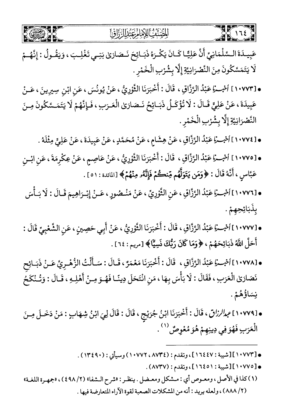 10778- أخبرنا عبد الرزاق، قال: أَخْبَرَنَا مَعْمَرٌ قَالَ: سَأَلْتُ الزُّهْرِيَّ عَن ذَبَائِحِ نَصَارَى الْعَرَبِ، فَقَالَ: لاَ بَأْسَ بِهَا، مَنِ انْتَحَلَ دِينًا فَهُوَ مِنْ أَهْلِهِ، قَالَ: وَتُنْكَحُ نِسَاؤُهُمْ.
