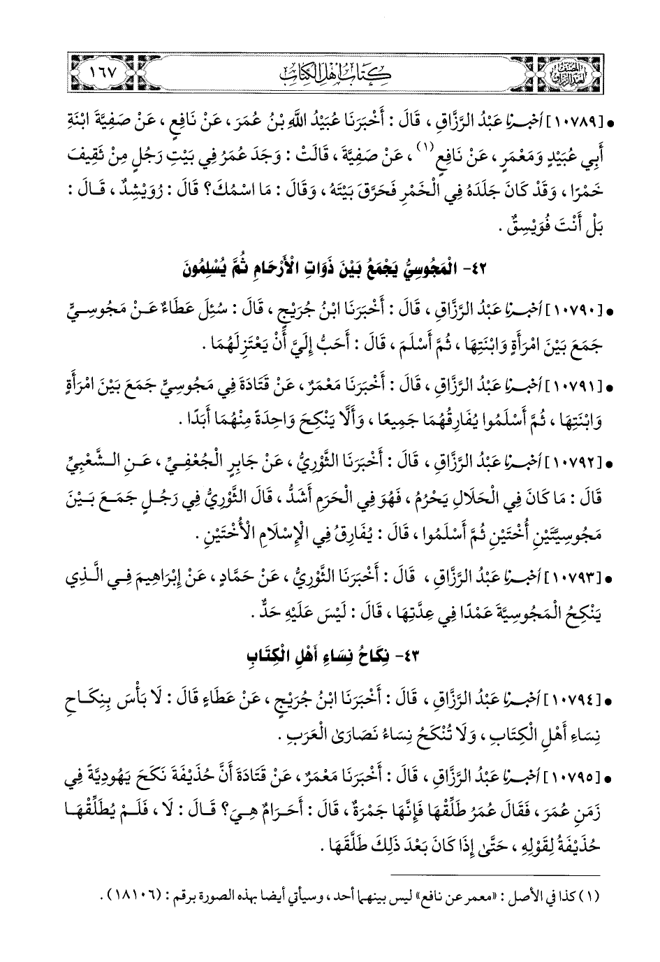 10795- أخبرنا عبد الرزاق، قال: أَخْبَرَنَا مَعْمَرٌ، عَن قَتَادَةَ؛ أَنَّ حُذَيْفَةَ نَكَحَ يَهُودِيَّةً فِي زَمَنِ عُمَرَ، فَقَالَ عُمَرُ: طَلِّقْهَا، فَإِنَّهَا جَمْرَةٌ، قَالَ: أَحَرَامٌ هِيَ؟ قَالَ: لاَ، فَلَمْ يُطَلِّقْهَا حُذَيْفَةُ لِقَوْلِهِ، حَتَّى إِذَا كَانَ بَعْدَ ذَلِكَ طَلَّقَهَا.