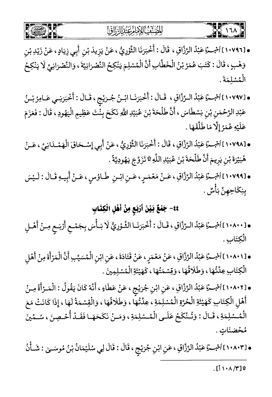 10798- أخبرنا عبد الرزاق، قال: أَخْبَرَنَا الثَّورِيُّ، عَنْ أَبِي إِسْحَاقَ الْهَمْدَانِيِّ، عَن هُبَيْرَةَ بْنِ يَرِيمَ؛ أَنَّ طَلْحَةَ بن عُبَيْدِ اللهِ تَزَوَّجَ يَهُودِيَّةً.