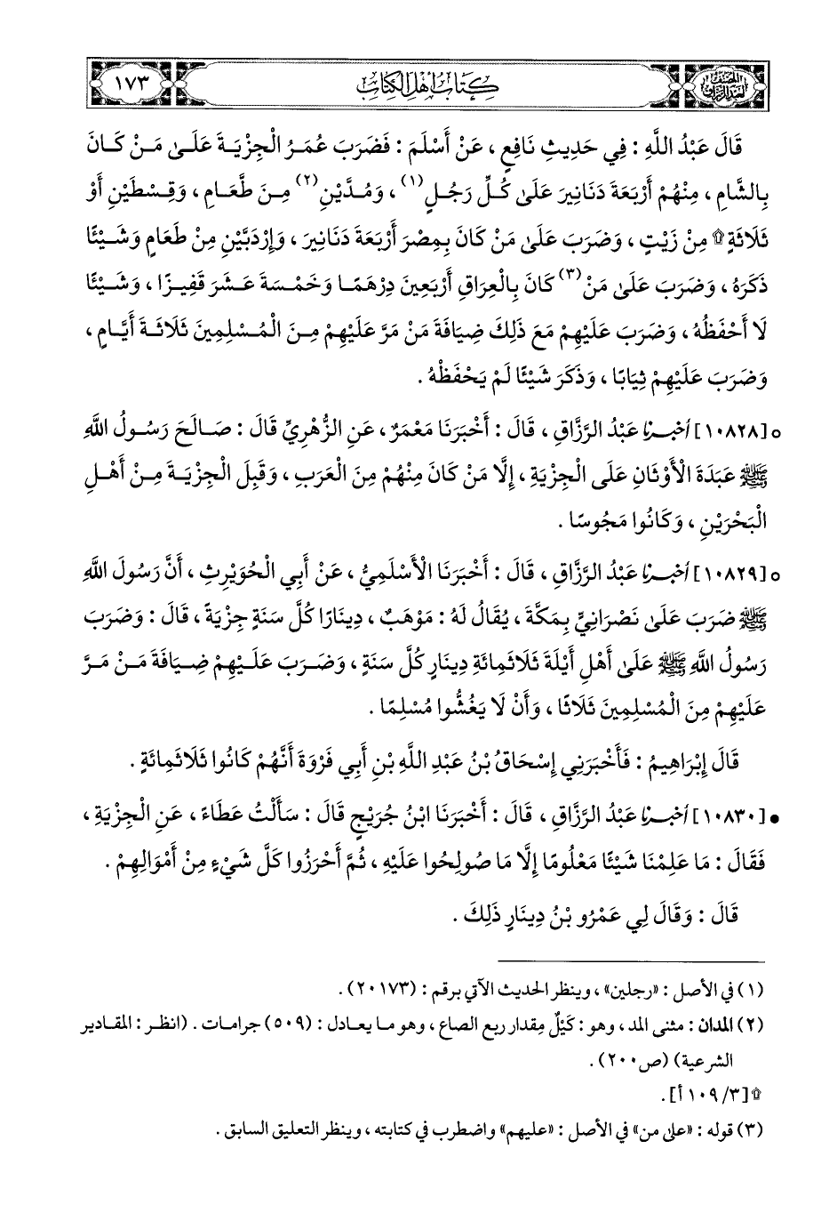 10828- أخبرنا عبد الرزاق، قال: أَخْبَرَنَا مَعْمَرٌ، عَنِ الزُّهْرِيِّ، قَالَ: صَالَحَ رَسُولُ اللهِ صَلَّى اللهُ عَلَيْهِ وَسَلَّمَ عَبَدَةَ الأَوْثَانِ عَلَى الْجِزْيَةِ، إِلاَّ مَنْ كَانَ مِنْهُمْ مِنَ الْعَرَبِ، وَقَبِلَ الْجِزْيَةَ مِنْ أَهْلِ الْبَحْرَيْنِ، وَكَانُوا مَجُوسًا.