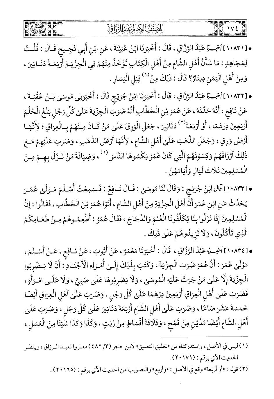 10832- أخبرنا عبد الرزاق، أَخْبَرَنَا ابْنُ جُرَيْجٍ، قَالَ: أَخْبَرَنِي مُوسَى بن عُقْبَةَ، عَن نَافِعٍ، أَنَّهُ حَدَّثَهُ عَن عُمَرَ بْنِ الْخَطَّابِ؛ أَنَّهُ ضَرَبَ الْجِزْيَةَ عَلَى كُلِّ رَجُلٍ بَلَغَ الْحُلُمَ أَرْبَعِينَ دِرْهَمًا، أَوْ أَرْبَعَةَ دَنَانِيرَ، جَعَلَ الْوَرِقَ عَلَى مَنْ كَانَ مِنْهُمْ بِالْعِرَاقِ؛ لأَنَّهَا أَرْضُ وَرِقٍ، وَجَعَلَ الذَّهَبَ عَلَى أَهْلِ الشَّامِ، لأَنَّهَا أَرْضُ الذَّهَبِ، وَضَرَبَ عَلَيْهِمْ مَعَ ذَلِكَ أَرْزَاقَهُمْ وَكِسْوَتَهُمُ الَّتِي كَانَ عُمَرُ يَكْسُوهَا النَّاسَ، وَضِيَافَةَ مَنْ نَزَلَ بِهِمْ مِنَ المُسْلِمِينَ ثَلاَثَ لَيَالٍ وَأَيَّامِهِنَّ.
