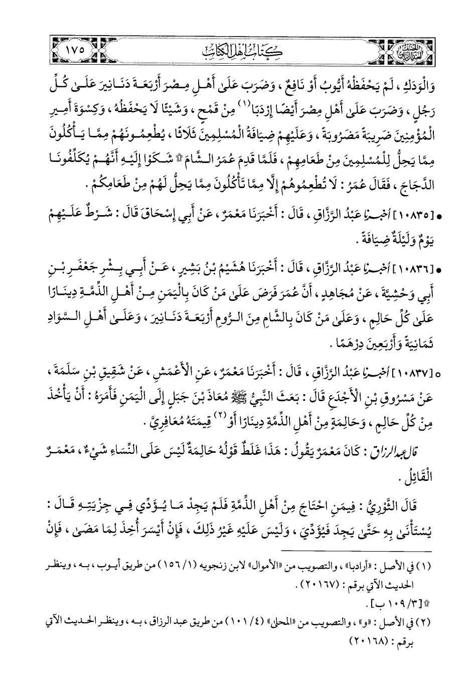 10836- أخبرنا عبد الرزاق، قَالَ: أَخْبَرَنَا هُشَيْمُ بْنُ بَشِيرٍ، عَنْ أَبِي بِشْرٍ جَعْفَرِ بْنِ أَبِي وَحْشِيَّةِ، عَنْ مُجَاهِدٍ؛ أَنَّ عُمَرَ فَرَضَ عَلَى مَنْ كَانَ بِالْيَمَنِ، مِنْ أَهْلِ الذِّمَّةِ، دِينَارًا عَلَى كُلِّ حَالِمٍ، وَعَلَى مَنْ كَانَ بِالشَّامِ، مِنَ الرُّومِ أَرْبَعَةَ دَنَانِيرَ، وَعَلَى أَهْلِ السَّوَادِ ثَمَانِيَةً وَأَرْبَعِينَ دِرْهَمًا.