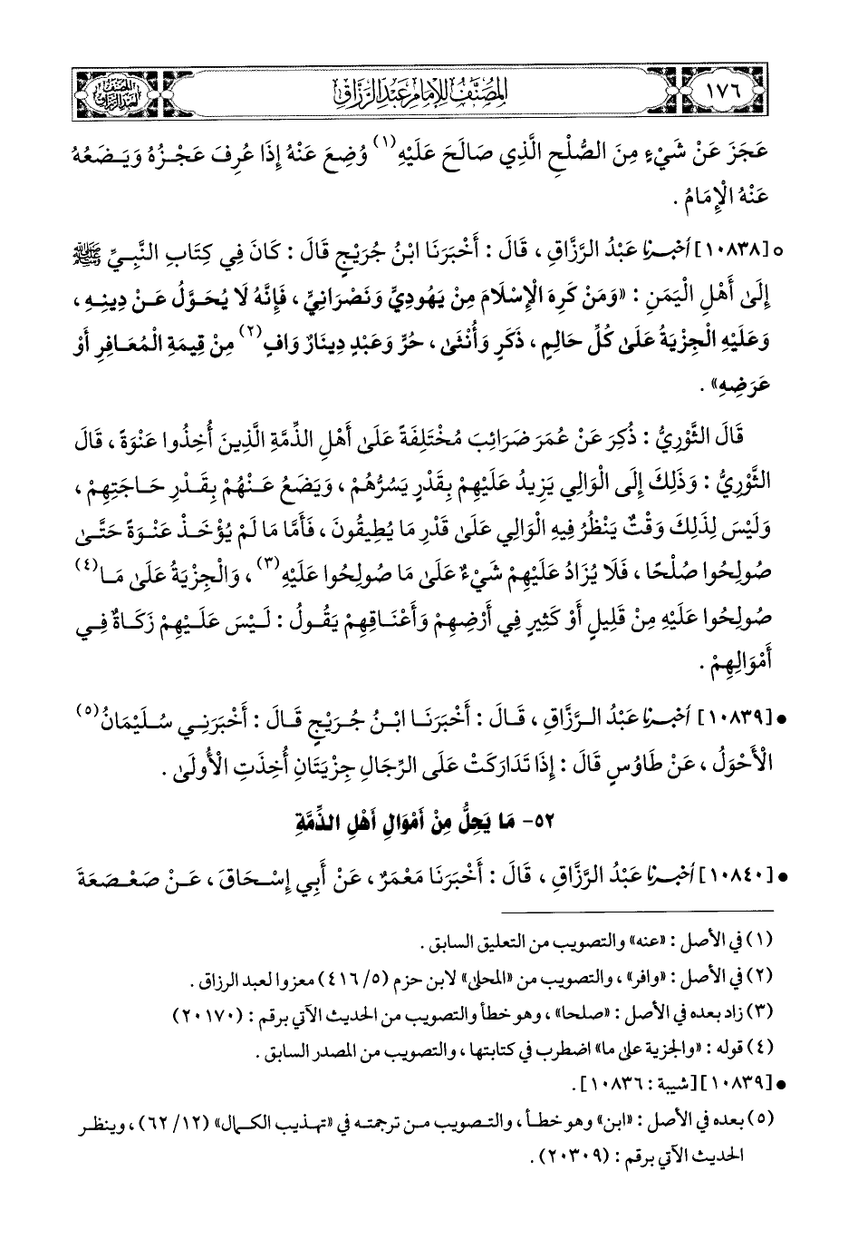 10838 - أخبرنا عبد الرزاق، قال: أَخْبَرَنَا ابْنُ جُرَيْجٍ، قَالَ: كَانَ فِي كِتَابِ النَّبِيِّ صَلَّى اللهُ عَلَيْهِ وَسَلَّمَ إِلَى أَهْلِ الْيَمَنِ: وَمَنْ كَرِهَ الإِسْلاَمَ مِنْ يَهُودِيٍّ وَنَصْرَانِيٍّ، فَإِنَّهُ لاَ يُحَوَّلُ عَن دِينِهِ، وَعَلَيْهِ الْجِزْيَةُ عَلَى كُلِّ حَالِمٍ، ذَكَرٍ وَأُنْثَى، حُرٍّ وَعَبْدٍ دِينَارٌ وَافٍ مِنْ قِيمَةِ المُعَافِرِ، أَوْ عَرَضِهِ.