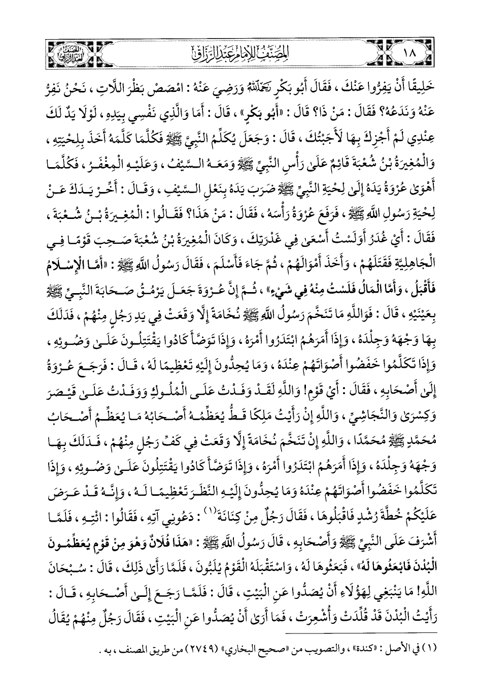 فَقَالَ: مَنْ هَذَا؟ فَقَالُوا: المُغِيرَةُ بن شُعْبَةَ، فَقَالَ: أَيْ غُدَرُ، أَوَلَسْتُ أَسْعَى فِي غَدْرَتِكَ، وَكَانَ المُغِيرَةُ بن شُعْبَةَ صَحِبَ قَوْمًا فِي الْجَاهِلِيَّةِ، فَقَتَلَهُمْ، وَأَخَذَ أَمْوَالَهُمْ، ثُمَّ جَاءَ فَأَسْلَمَ، فَقَالَ رَسُولُ اللهِ صَلَّى اللهُ عَلَيْهِ وَسَلَّمَ: أَمَّا الإِسْلاَمُ فَأَقْبَلُ، وَأَمَّا المَالُ، فَلَسْتُ مِنْهُ فِي شَيْءٍ، ثُمَّ إِنَّ عُرْوَةَ جَعَلَ يَرْمُقُ صَحَابَةَ النَّبِيِّ صَلَّى اللهُ عَلَيْهِ وَسَلَّمَ بِعَيْنَيْهِ، قَالَ: فَوَاللهِ مَا تَنَخَّمَ رَسُولُ اللهِ صَلَّى اللهُ عَلَيْهِ وَسَلَّمَ نُخَامَةً، إِلاَّ وَقَعَتْ فِي يَدِ رَجُلٍ مِنْهُمْ، فَدَلَكَ بِهَا وَجْهَهُ وَجِلْدَهُ، وَإِذَا أَمَرَهُمُ ابْتَدَرُوا أَمْرَهُ، وَإِذَا تَوَضَّأَ كَادُوا يَقْتَتِلُونَ عَلَى وَضُوئِهِ، وَإِذَا تَكَلَّمُوا خَفَضُوا أَصْوَاتَهُمْ عِنْدَهُ، وَمَا يُحِدُّونَ إِلَيْهِ النَّظَرَ تَعْظِيمًا لَهُ، قَالَ: فَرَجَعَ عُرْوَةُ إِلَى أَصْحَابِهِ، فَقَالَ: أَيْ قَوْمِ، وَاللهِ لَقَدْ وَفَدْتُ عَلَى المُلُوكِ، وَوَفَدْتُ عَلَى قَيْصَرَ وَكِسْرَى وَالنَّجَاشِيِّ، وَاللهِ إِنْ رَأَيْتُ مَلِكًا قَطُّ يُعَظِّمُهُ أَصْحَابُهُ مَا يُعَظِّمُ أَصْحَابُ مُحَمَّدٍ صَلَّى اللهُ عَلَيْهِ وَسَلَّمَ مُحَمَّدًا، وَاللهِ إِنْ تَنَخَّمَ نُخَامَةً إِلاَّ وَقَعَتْ فِي كَفِّ رَجُلٍ مِنْهُمْ، فَدَلَكَ بِهَا وَجْهَهُ وَجِلْدَهُ، وَإِذَا أَمَرَهُمُ ابْتَدَرُوا أَمْرَهُ، وَإِذَا تَوَضَّأَ كَادُوا يَقْتَتِلُونَ عَلَى وَضُوئِهِ، وَإِذَا تَكَلَّمُوا خَفَضُوا أَصْوَاتَهُمْ عِنْدَهُ، وَمَا يُحِدُّونَ إِلَيْهِ النَّظَرَ، تَعْظِيمًا لَهُ، وَإِنَّهُ قَدْ عَرَضَ عَلَيْكُمْ خُطَّةَ رُشْدٍ فَاقْبَلُوهَا، فَقَالَ رَجُلٌ مِنْ كِنَانَةَ دَعُونِي آتِهِ، فَقَالُوا: ائْتِهِ،