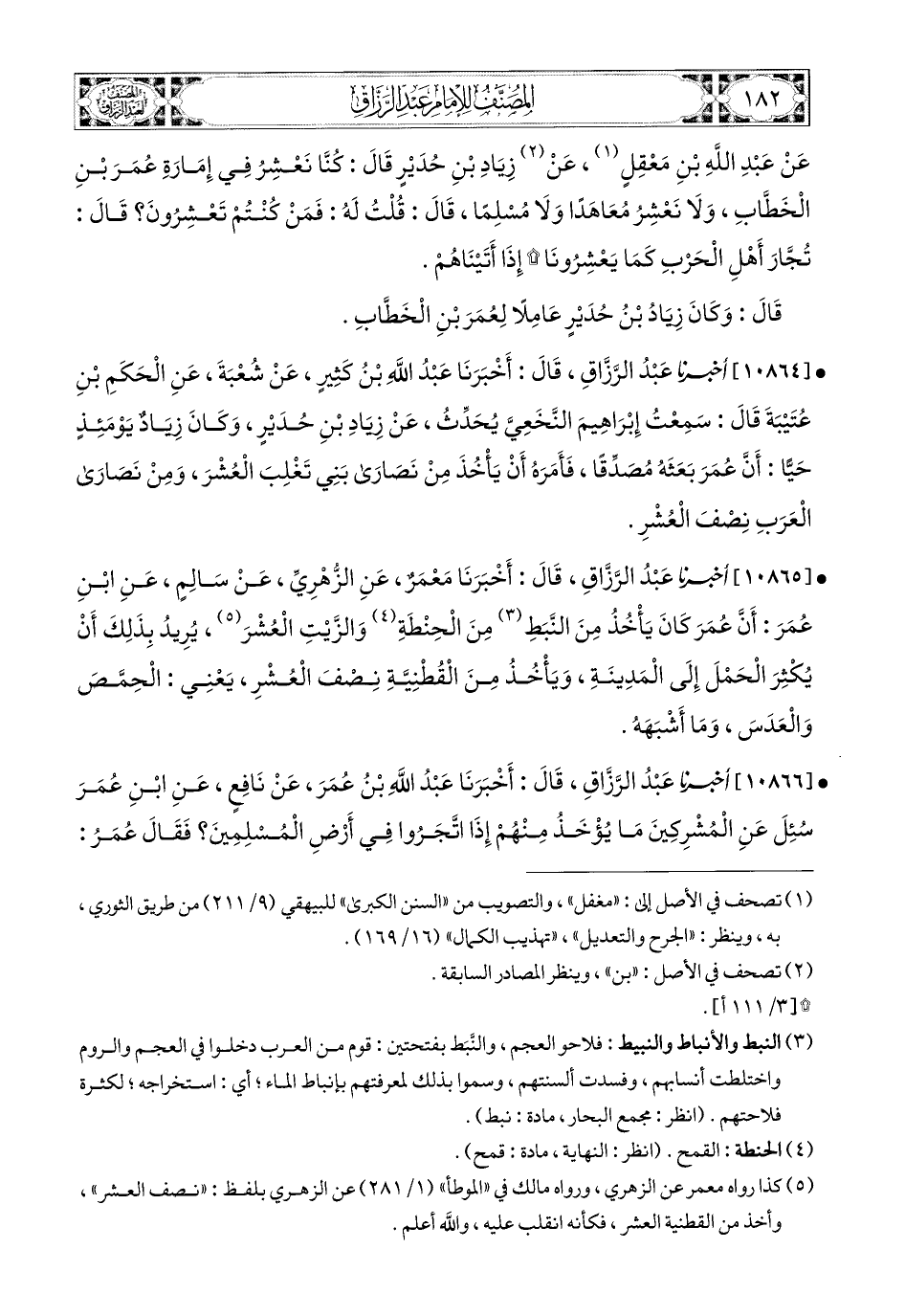 10865- أخبرنا عبد الرزاق، قال: أَخْبَرَنَا مَعْمَرٌ، عَنِ الزُّهْرِيِّ، عَن سَالِمٍ، عَنِ ابْنِ عُمَرَ؛ أَنَّ عُمَرَ كَانَ يَأْخُذُ مِنَ النَّبَطِ مِنَ الْحِنْطَةِ وَالزَّيْتِ الْعُشْرَ، يُرِيدُ بِذَلِكَ أَنْ يُكْثِرَ الْحِمْلَ إِلَى المَدِينَةِ، وَيَأْخُذُ مِنَ الْقُطْنِيَّةِ نِصْفَ الْعُشْرِ، يَعْنِي: الْحِمَّصَ وَالْعَدَسَ، وَمَا أَشْبَهَهُ.