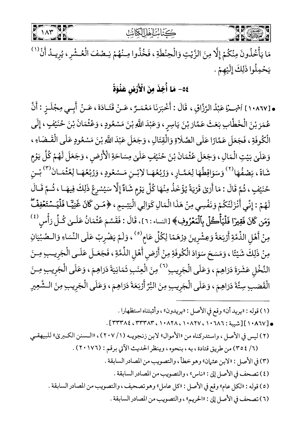 10867- أخبرنا عبد الرزاق، قال: أَخْبَرَنَا مَعْمَرٌ، عَن قَتَادَةَ، عَنْ أَبِي مِجْلَزٍ؛ أَنَّ عُمَرَ بن الْخَطَّابِ بَعَثَ عَمَّارَ بن يَاسِرٍ، وَعَبْدَ اللهِ بن مَسْعُودٍ، وَعُثْمَانَ بن حُنَيْفٍ إِلَى الْكُوفَةِ، فَجَعَلَ عَمَّارًا عَلَى الصَّلاَةِ وَالْقِتَالِ، وَجَعَلَ عَبدَ اللهِ بن مَسْعُودٍ عَلَى الْقَضَاءِ، وَعَلَى بَيْتِ المَالِ، وَجَعَلَ عُثْمَانَ بن حُنَيْفٍ عَلَى مِسَاحَةِ الأَرْضِ، وَجَعَلَ لَهُمْ كُلَّ يَوْمٍ شَاةً، نِصْفُهَا وَسَوَاقِطُهَا لِعَمَّارٍ، وَرُبُعُهَا لاِبْنِ مَسْعُودٍ، وَرُبُعُهَا لِعُثْمَانَ بْنِ حُنَيْفٍ، ثُمَّ قَالَ: مَا أَرَى قَرْيَةً يُؤْخَذُ مِنْهَا كُلَّ يَوْمٍ شَاةٌ إِلاَّ سَيُسْرِعُ ذَلِكَ فِيهَا، ثُمَّ قَالَ لَهُمْ: إِنِّي أَنْزَلَتْكُمْ وَنَفْسِي مِنْ هَذَا المَالِ كَوَالِي الْيَتِيمِ: {مَنْ كَانَ غِنِيًّا فَلْيَسْتَعْفِفْ وَمَنْ كَانَ فَقِيرًا فَلْيَأْكُلْ بِالمَعْرُوفِ}، قَالَ: فَقَسَّمَ عُثْمَانُ عَلَى كُلِّ رَأْسٍ مِنْ أَهْلِ الذِّمَّةِ أَرْبَعَةً وَعِشْرِينَ دِرْهَمًا لِكُلِّ عَامٍ، وَلَمْ يَضْرِبْ عَلَى النِّسَاءِ وَالصِّبَيَانِ مِنْ ذَلِكَ شَيْئًا، وَمَسَحَ سَوَادَ الْكُوفَةِ مِنْ أَرْضِ أَهْلِ الذِّمَّةِ، فَجَعَلَ عَلَى الْجَرِيبِ مِنَ النَّخْلِ عَشَرَةَ دَرَاهِمَ، وَعَلَى الْجَرِيبِ مِنَ الْعِنَبِ ثَمَانِيَةَ دَرَاهِمَ، وَعَلَى الْجَرِيبِ مِنَ الْقَصَبِ سِتَّةَ دَرَاهِمَ، وَعَلَى الْجَرِيبِ مِنَ البُّرِّ أَرْبَعَةَ دَرَاهِمَ، وَعَلَى الْجَرِيبِ مِنَ الشَّعِيرِ دِرْهَمَيْنِ، وَأَخَذَ مِنْ تُجَّارِ أَهْلِ الذِّمَّةِ مِنْ كُلٍّ عِشْرِينَ دِرْهَمًا دِرْهَمًا، فَرَفَعَ ذَلِكَ إِلَى عُمَرَ فَرَضِيَ بِهِ.