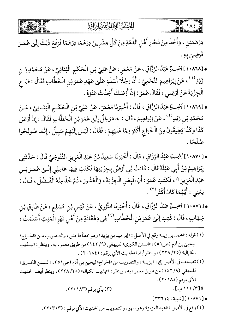 10870- أخبرنا عبد الرزاق، قال: أَخْبَرَنَا سَعيدُ بن عَبدِ الْعَزِيزِ التَّنُوخِيُّ، قَالَ: حَدَّثَنِي إِبرَاهِيمُ بن أَبِي عَبْلَةَ، قَالَ: كَانَتْ لِي أَرْضٌ بِجِزْيتِهَا فَكَتَبَ فِيهَا عَامِلِي إِلَى عُمَرَ بْنِ عَبدِ الْعَزِيزِ، فَكَتَبَ عُمَرُ: أَنِ اقْبِضِ الْجِزْيَةَ، وَالْعُشُورَ، ثُمَّ خُذْ مِنْهُ الْفَضْلَ، قَالَ: يَعْنِي: أَيُّهُمَا كَانَ أَكْثَرَ.