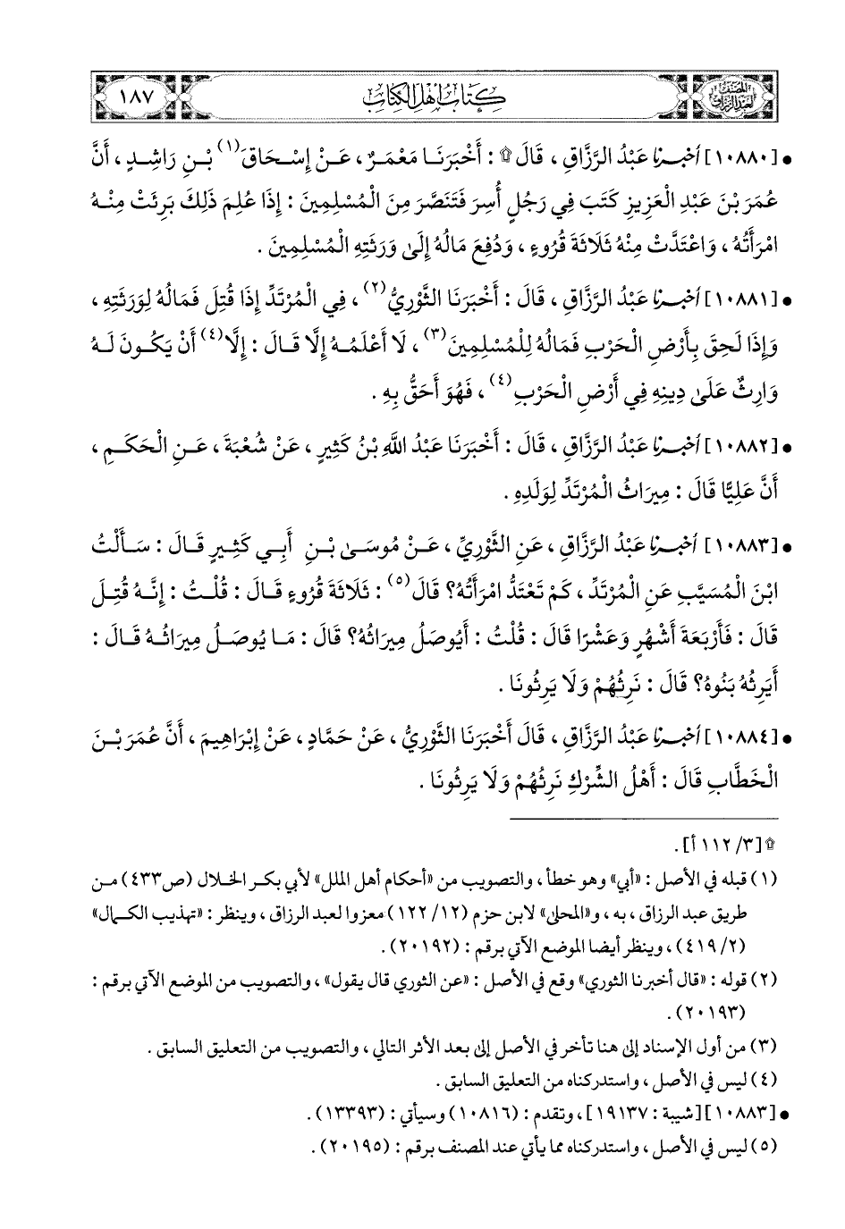 10880- أخبرنا عبد الرزاق، قال: أَخْبَرَنَا مَعْمَرٌ، عَن إِسْحَاقَ بْنِ رَاشِدٍ، أَنَّ عُمَرَ بن عَبدِ الْعَزِيزِ كَتَبَ فِي رَجُلٍ أُسِرَ فَتَنَصَّرَ مِنَ المُسْلِمِينَ: إِذَا عُلِمَ ذَلِكَ بَرِئَتْ مِنْهُ امْرَأَتُهُ، وَاعْتَدَّتْ مِنْهُ ثَلاَثَةَ قُرُوءٍ، وَدُفِعَ مَالُهُ إِلَى وَرَثَتِهِ المُسْلِمِينَ.