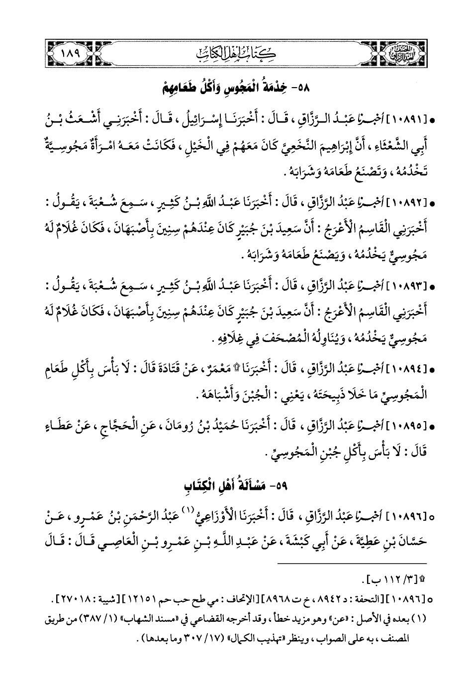 10891- أخبرنا عبد الرزاق، قال: أَخْبَرَنَا إِسْرَائِيلُ، قَالَ: أَخْبَرَنِي أَشْعَثُ بن أَبِي الشَّعْثَاءِ؛ أَنَّ إِبرَاهِيمَ النَّخَعِيَّ كَانَ مَعَهُمْ فِي الْخَيْلِ، فَكَانَتْ مَعَهُ امْرَأَةٌ مَجُوسِيَّةٌ تَخْدُمُهُ، وَتَصْنَعُ طَعَامَهُ وَشَرَابَهُ.