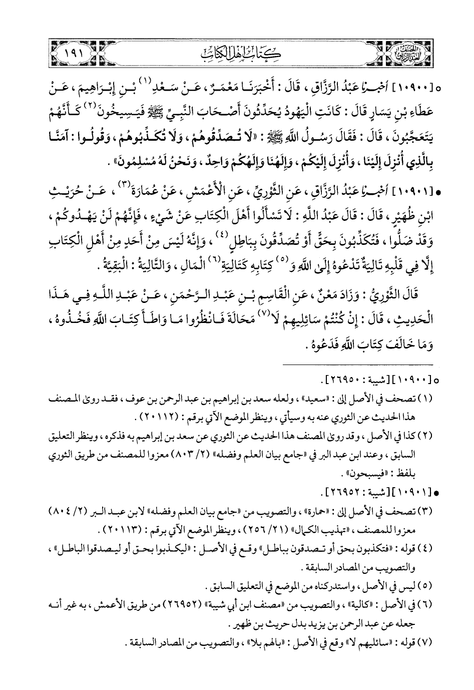 10900- أخبرنا عبد الرزاق، قال: أَخْبَرَنَا مَعْمَرٌ، عَن سَعْدِ بْنِ إِبرَاهِيمَ، عَنْ عَطَاءِ بْنِ يَسَارٍ، قَالَ: كَانَتِ الْيَهُودُ يُحَدِّثُونَ أَصْحَابَ النَّبِيِّ صَلَّى اللهُ عَلَيْهِ وَسَلَّمَ، فَيَسِيخُونَ كَأَنَّهُمْ يَتَعَجَّبُونَ، قَالَ: فَقَالَ رَسُولُ اللهِ صَلَّى اللهُ عَلَيْهِ وَسَلَّمَ: لاَ تُصَدِّقُوهُمْ، وَلاَ تُكَذِّبُوهُمْ، وَقُولُوا: آمَنَّا بِالَّذِي أُنْزِلَ إِلَيْنَا، وَأُنْزِلَ إِلَيْكُمْ، وَإِلَهُنَا وَإِلَهُكُمْ وَاحِدٌ، وَنَحْنُ لَهُ مُسْلِمُونَ.