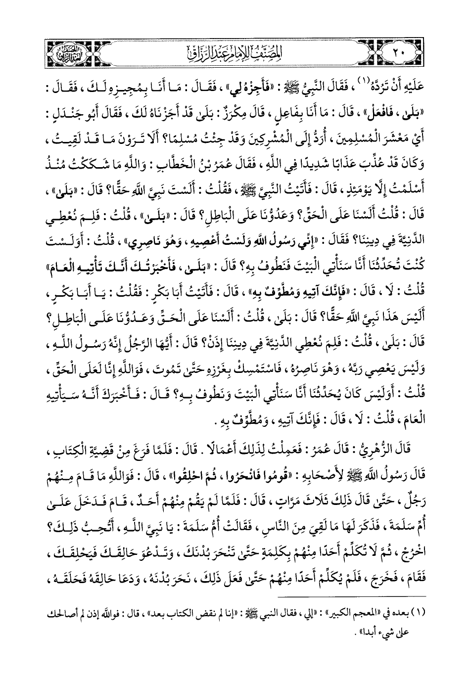 فَأَجِزْهُ لِي، فَقَالَ: مَا أَنَا بِمُجِيزِهِ لَكَ، فَقَالَ: بَلَى، فَافْعَلْ، قَالَ: مَا أَنَا بِفَاعِلٍ، قَالَ مِكْرَزٌ: بَلَى قَدْ أَجَزْنَاهُ لَكَ، فَقَالَ أَبو جَنْدَلٍ: أَيْ مَعْشَرَ المُسْلِمِينَ، أُرَدُّ إِلَى المُشْرِكِينَ وَقَدْ جِئْتُ مُسْلِمًا؟ أَلاَ تَرَوْنَ مَا قَدْ لَقِيتُ، وَكَانَ قَدْ عُذِّبَ عَذَابًا شَدِيدًا فِي اللهِ، فَقَالَ عُمَرُ بن الْخَطَّابِ: وَاللهِ مَا شَكَكْتُ مُنْذُ أَسْلَمْتُ إِلاَّ يَوْمَئِذٍ، قَالَ: فَأَتَيْتُ النَّبِيَّ صَلَّى اللهُ عَلَيْهِ وَسَلَّمَ، فَقُلْتُ: أَلَسْتَ نَبِيَّ اللهِ حَقًّا؟ قَالَ: بَلَى، قَالَ: قُلْتُ أَلَسْنَا عَلَى الْحَقِّ؟ وَعَدُوُّنَا عَلَى الْبَاطِلِ؟ قَالَ: بَلَى، قُلْتُ: فَلِمَ نُعْطَى الدَّنِيَّةَ فِي دِينِنَا؟ فَقَالَ: إِنِّي رَسُولُ اللهِ، وَلَسْتُ أَعْصِيهِ، وَهُوَ نَاصِرِي، قُلْتُ: أَوَلَسْتَ كُنْتَ تُحَدِّثُنَا أَنَّا سَنَأْتِي الْبَيْتَ، فَنَطُوفُ بِهِ؟ قَالَ: بَلَى، فَأَخْبَرْتُكَ أَنَّكَ تَأْتِيهِ الْعَامَ؟ قُلْتُ: لاَ، قَالَ: فَإِنَّكَ آتِيهِ وَمُطَوِّفٌ بِهِ، قَالَ: فَأَتَيْتُ أَبَا بَكْرٍ: فَقُلْتُ: يَا أَبَا بَكْرٍ، أَلَيْسَ هَذَا نَبِيَّ اللهِ حَقًّا؟ قَالَ: بَلَى، قُلْتُ: أَلَسْنَا عَلَى الْحَقِّ، وَعَدُوُّنَا عَلَى الْبَاطِلِ؟ قَالَ: بَلَى، قُلْتُ: فَلِمَ نُعْطَى الدَّنِيَّةَ فِي دِينِنَا إِذنْ؟ قَالَ: أَيُّهَا الرَّجُلُ، إِنَّهُ رَسُولُ اللهِ، وَلَيْسَ يَعْصِي رَبَّهُ، وَهُوَ نَاصِرُهُ، فَاسْتَمْسِكْ بِغَرْزِهِ حَتَّى تَمُوتَ، فَوَاللهِ إِنَّا لَعَلَى الْحَقِّ.