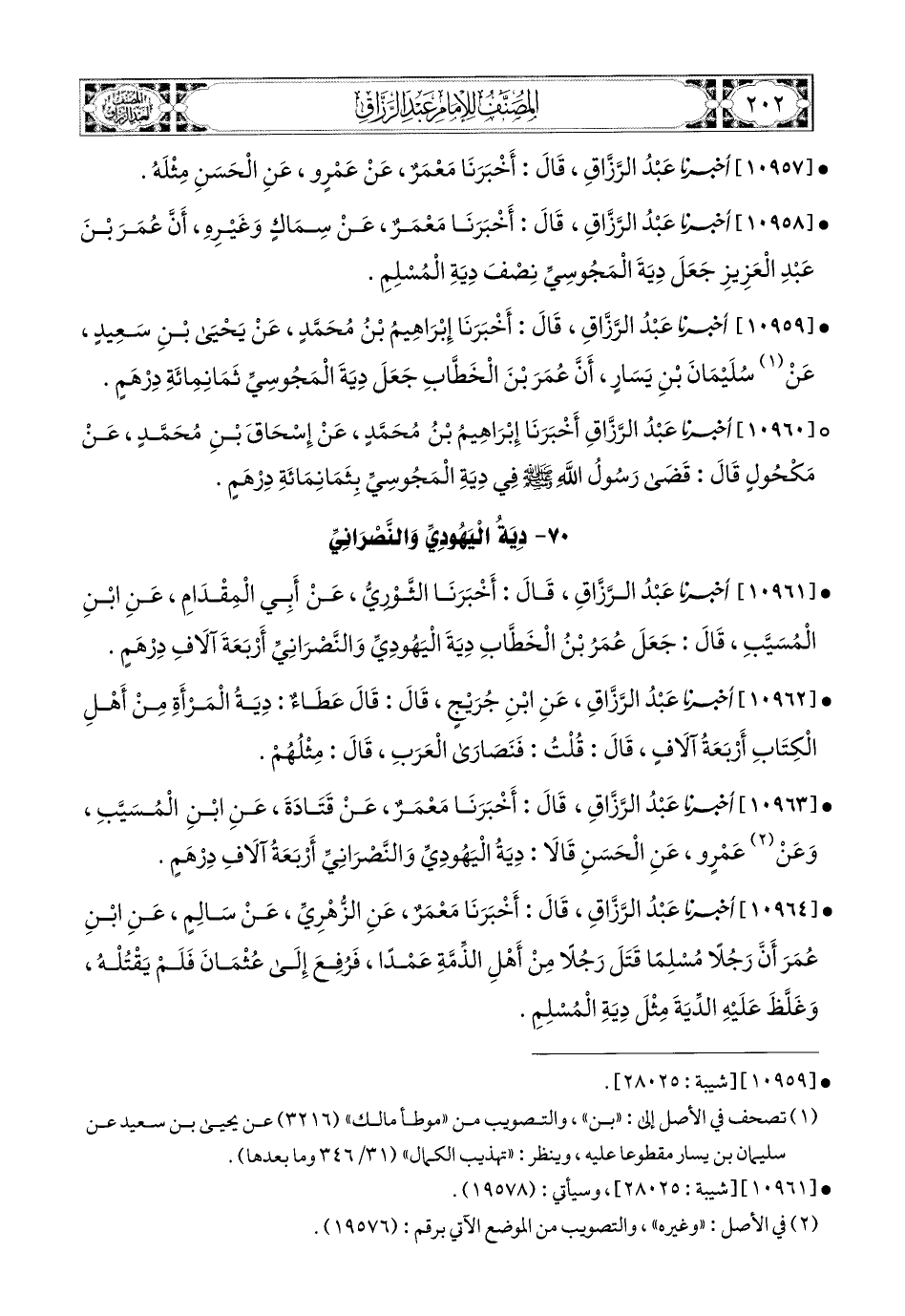 10963- أخبرنا عبد الرزاق، قال: أَخْبَرَنَا مَعْمَرٌ، عَن قَتَادَةَ، عَنِ ابْنِ المُسَيَّبِ، وَعَنْ عَمْرٍو، عَنِ الْحَسَنِ، قَالاَ: دِيَةُ الْيَهُودِيِّ وَالنَّصْرَانِيِّ أَرْبَعَةُ آلاَفِ دِرْهَمٍ.