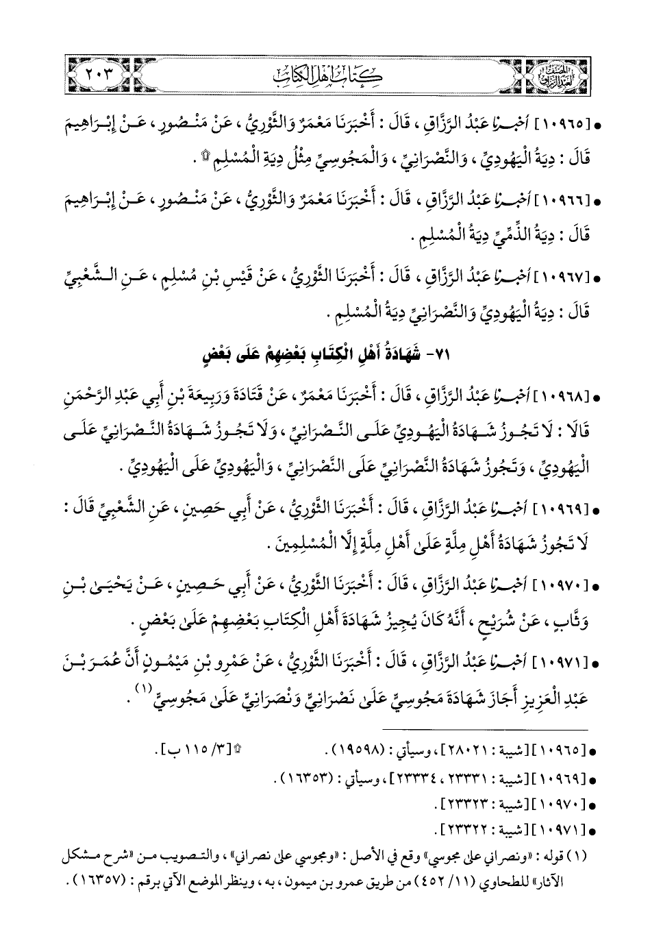 10971- أخبرنا عبد الرزاق، قال: أَخْبَرَنَا الثَّورِيُّ، عَنْ عَمْرِو بنِ مَيْمُونٍ؛ أَنَّ عُمَرَ بن عَبدِ الْعَزِيزِ أَجَازَ شَهَادَةَ مَجُوسِيٍّ عَلَى نَصْرَانِيٍّ، وَنَصْرَانِيٍّ عَلَى مَجُوسِيٍّ.