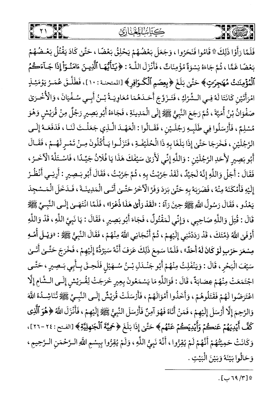 ثُمَّ رَجَعَ النَّبِيُّ صَلَّى اللهُ عَلَيْهِ وَسَلَّمَ إِلَى المَدِينَةِ، فَجَاءَهُ أَبو بَصِيرٍ، رَجُلٌ مِنْ قُرَيْشٍ وَهُوَ مُسْلِمٌ، فَأَرْسَلُوا فِي طَلَبِهِ رَجُلَيْنِ، فَقَالُوا: الْعَهْدَ الَّذِي جَعَلْتَ لَنَا، فَدَفَعَهُ إِلَى الرَّجُلَيْنِ، فَخَرَجَا، حَتَّى إِذَا بَلَغَا بِهِ ذَا الْحُلَيْفَةِ، فَنَزَلُوا يَأْكُلُونَ مِنْ تَمْرٍ لَهُمْ، فَقَالَ أَبو بَصِيرٍ لأَحَدِ الرَّجُلَيْنِ: وَاللهِ إِنِّي لأَرَى سَيْفَكَ هَذَا يَا فُلاَنُ جَيِّدًا، فَاسْتَلَّهُ الآخَرُ، فَقَالَ: أَجَلْ، وَاللهِ إِنَّهُ لَجَيِّدٌ، لَقَدْ جَرَّبْتُ بِهِ، ثُمَّ جَرَّبْتُ، فَقَالَ أَبو بَصِيرٍ: أَرِنِي أَنْظُرُ إِلَيْهِ، فَأَمْكَنَهُ مِنْهُ، فَضَرَبَهُ بِهِ، حَتَّى بَرَدَ، وَفَرَّ الآخَرُ، حَتَّى أَتَى المَدِينَةَ، فَدَخَلَ المَسْجِدَ يَعْدُو، فَقَالَ رَسُولُ اللهِ صَلَّى اللهُ عَلَيْهِ وَسَلَّمَ حِينَ رَآهُ: لَقَدْ رَأَى هَذَا ذُعْرًا، فَلَمَّا انْتَهَى إِلَى النَّبِيِّ صَلَّى اللهُ عَلَيْهِ وَسَلَّمَ قَالَ: قُتِلَ وَاللهِ صَاحِبِي، وَإِنِّي لَمَقْتُولٌ، فَجَاءَ أَبو بَصِيرٍ، فَقَالَ: يَا نَبِيَّ اللهِ، قَدْ وَاللهِ أَوْفَى اللهُ ذِمَّتَكَ، قَدْ رَدَدْتَنِي إِلَيْهِمْ، ثُمَّ أَنْجَانِي اللهُ مِنْهُمْ، فَقَالَ النَّبِيُّ صَلَّى اللهُ عَلَيْهِ وَسَلَّمَ: وَيْلُ امِّهِ مِسْعَرَ حَرْبٍ، لَوْ كَانَ لَهُ أَحَدٌ، فَلَمَّا سَمِعَ ذَلِكَ، عَرَفَ أَنَّهُ سَيَرُدُّهُ إِلَيْهِمْ، فَخَرَجَ، حَتَّى أَتَى سَيْفَ الْبَحْرِ، قَالَ: وَيَنْفَلِتُ مِنْهُمْ أَبو جَنْدَلِ بْنِ سَيْهَلٍ، فَلَحِقَ بِأَبِي بَصِيرٍ، حَتَّى اجْتَمَعَتْ مِنْهُمْ عِصَابَةٌ.