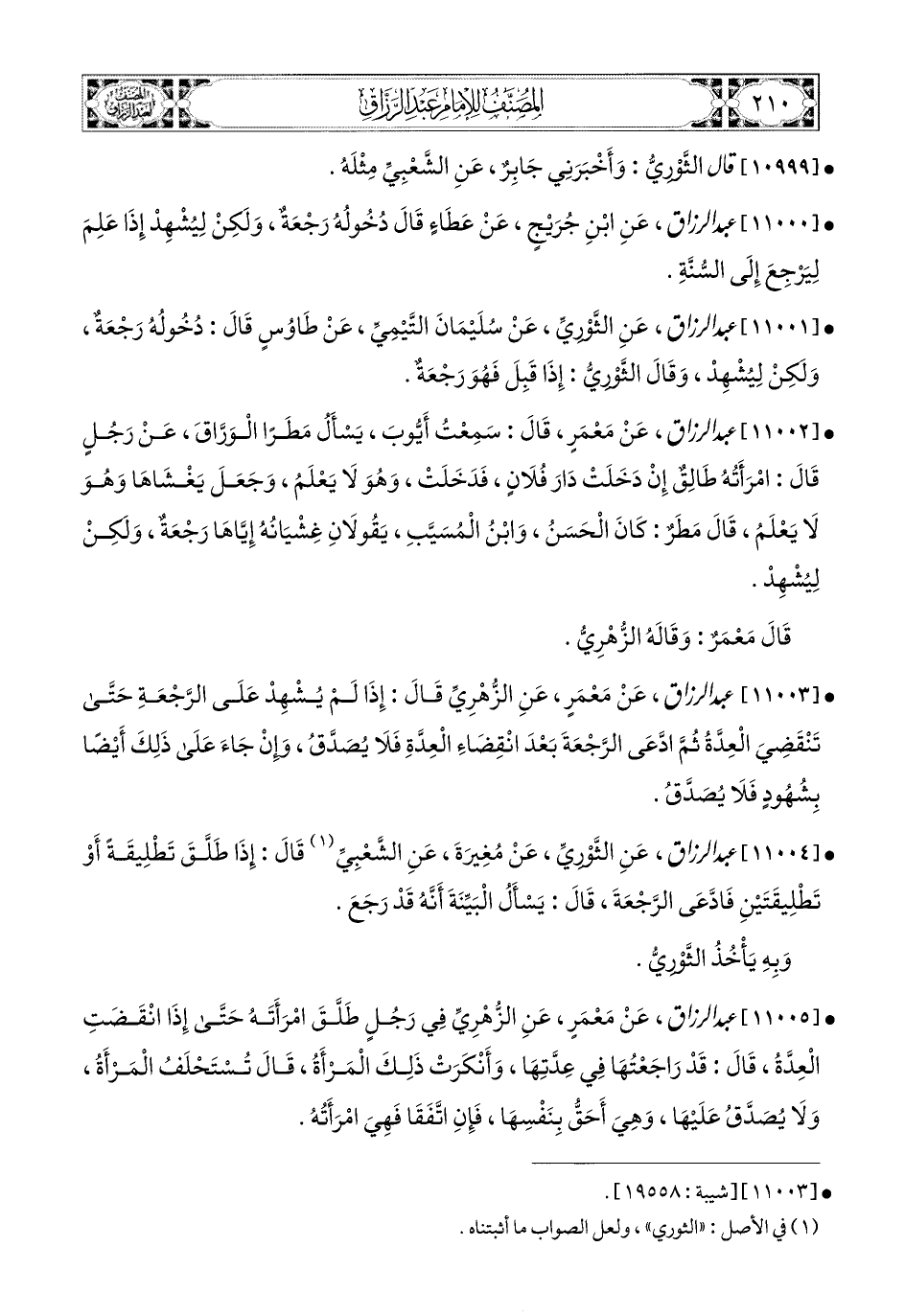 11003- عبد الرزاق، عَنْ مَعْمَرٍ، عَنِ الزُّهْرِيِّ، قَالَ: إِذَا لَمْ يُشْهِدْ عَلَى الرَّجْعَةِ حَتَّى تَنْقَضِيَ الْعِدَّةُ، ثُمَّ ادَّعَى الرَّجْعَةَ بَعْدَ انْقِضَاءِ الْعِدَّةِ فَلاَ يُصَدَّقُ، وَإِنْ جَاءَ عَلَى ذَلِكَ أَيْضًا بِشُهُودٍ فَلاَ يُصَدَّقُ.