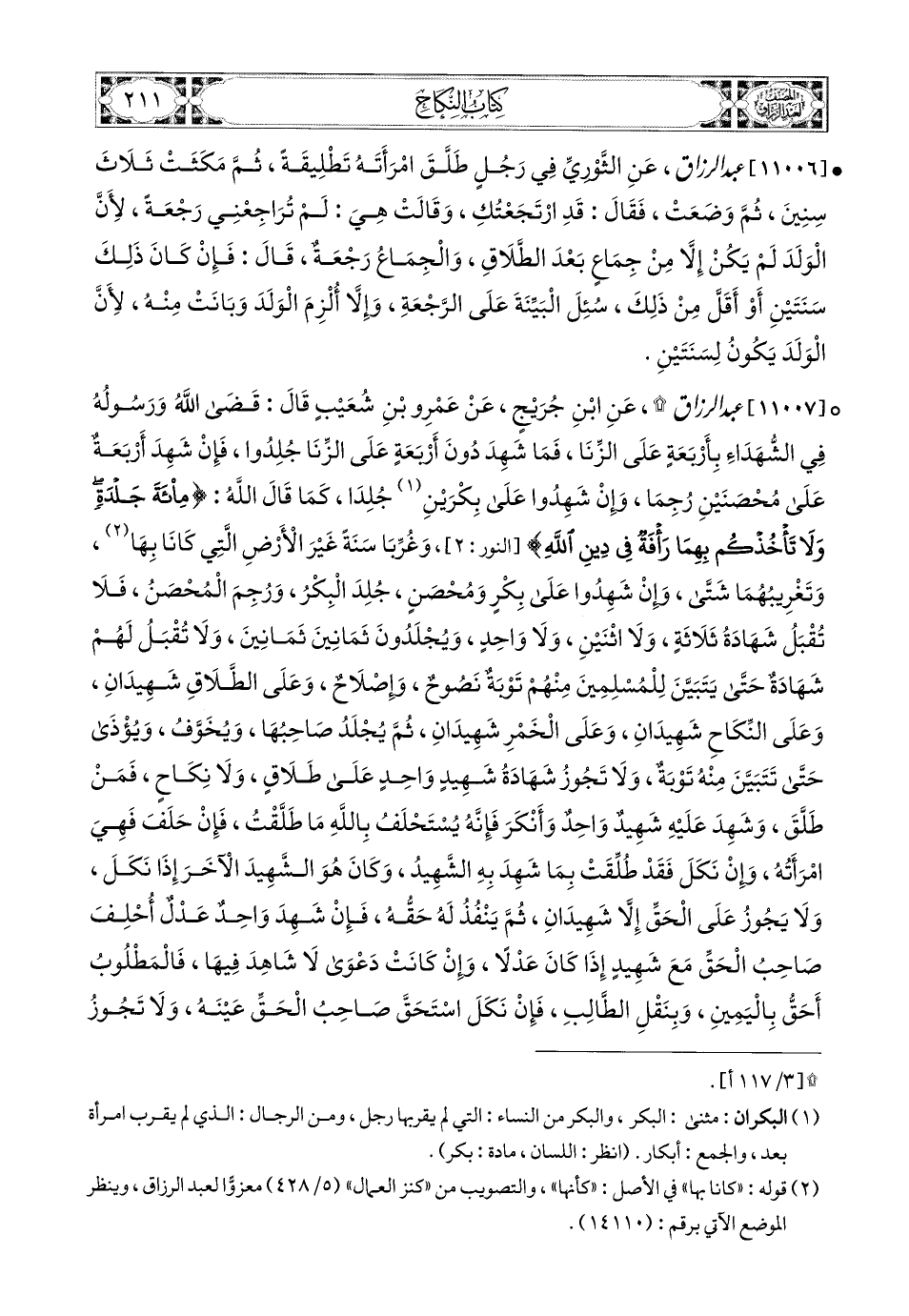11007 - عبد الرزاق، عَنِ ابْنِ جُرَيْجٍ، عَنْ عَمْرِو بنِ شُعَيْبٍ، قَالَ: قَضَى اللهُ وَرَسُولُهُ فِي الشُّهَدَاءِ بِأَرْبَعَةٍ عَلَى الزِّنَا، فَمَا شَهِدَ دُونَ أَرْبَعَةٌ عَلَى الزِّنَا جُلِدُوا، فَإِنْ شَهِدَ أَرْبَعَةٌ عَلَى مُحْصَنَيْنِ رُجِمَا، وَإِنْ شَهِدُوا عَلَى بِكْرَيْنِ جُلِدَا، كَمَا قَالَ اللهُ: مِئَةَ جَلْدَةٍ: {وَلاَ تَأْخُذْكُمْ بِهِمَا رَأْفَةٌ فِي دِينِ اللهِ} وَغُرِّبَا سَنَةً، غَيْرَ الأَرْضِ الَّتِي كَانَا بِهَا، وَتَغْرِيبُهُمَا شَتَّى، وَإِنْ شَهِدُوا عَلَى بِكْرٍ وَمُحْصَنٍ، جُلِدَ الْبِكْرُ، وَرُجِمَ المُحْصَنُ، فَلاَ تُقْبَلُ شَهَادَةُ ثَلاَثَةٍ، وَلاَ اثْنَيْنِ، وَلاَ وَاحِدٍ، وَيُجْلَدُونَ ثَمَانِينَ ثَمَانِينَ، وَلاَ تُقْبَلُ لَهُمْ شَهَادَةٌ، حَتَّى يَتَبَيَّنَ لِلْمُسْلِمِينَ مِنْهُمْ تَوْبَةٌ نَصُوحٌ، وَإِصْلاَحٌ، وَعَلَى الطَّلاَقِ شَهِيدَانِ، وَعَلَى النِّكَاحِ شَهِيدَانِ، وَعَلَى الْخَمْرِ شَهِيدَانِ، ثُمَّ يُجْلَدُ صَاحِبُهَا، وَيُخَوَّفُ، وَيُؤْذَى، حَتَّى تَتَبَيَّنَ مِنْهُ تَوْبَةٌ، وَلاَ تَجُوزُ شَهَادَةُ شَهِيدٍ وَاحِدٍ عَلَى طَلاَقٍ، وَلاَ نِكَاحٍ، فَمَنْ طَلَّقَ، وَشَهِدَ عَلَيْهِ شَهِيدٌ وَاحِدُ وَأَنْكَرَ، فَإِنَّهُ يُسْتَحْلَفُ باللهِ مَا طَلَّقْتُ، فَإِنْ حَلَفَ، فَهِيَ امْرَأَتُهُ، وَإِنْ نَكَلَ فَقَدْ طُلِّقَتْ بِمَا شَهِدَ بِهِ الشَّهِيدُ، وَكَانَ هُوَ الشَّهِيدُ الآخَرُ إِذَا نَكَلَ، وَلاَ يَجُوزُ عَلَى الْحَقِّ إِلاَّ شَهِيدَانِ، ثُمَّ يَنْفُذُ لَهُ حَقُّهُ، فَإِنْ شَهِدَ وَاحِدٌ عَدْلٌ أُحْلِفَ صَاحِبُ الْحَقِّ مَعَ شَهِيدٍ إِذَا كَانَ عَدْلاً، وَإِنْ كَانَتْ دَعْوَى لاَ شَاهِدَ فِيهَا، فَالمَطْلُوبُ أَحَقُّ بِالْيَمِينِ وَبِنقلِ (1) الطَّالِبِ، فَإِنْ نَكَلَ اسْتَحَقَّ صَاحِبُ الْحَقِّ عَيْنَهُ، وَلاَ تَجُوزُ شَهَادَةُ خَائِنٍ، وَلاَ خَائِنَةٍ، وَلاَ خَصْمٍ، يَكُونُ لاِمْرِئٍ غِمْرٌ (2) فِي نَفْسِ صَاحبِهِ، وَأَمَرَ اللهُ بِذَوَيْ عَدْلٍ مِنَ الشُّهَدَاءِ، وَقَالَ: {إِنَّ الَّذِينَ يَشْتَرُونَ بِعَهْدِ اللهِ وَأَيْمَانِهِمْ ثَمَنًا قَلِيلاً} الآيَةَ، فَلْيُنْظُرِ امْرُؤٌ عَلَى مَا يَشْهَدُ ويُقْسِمُ (3).