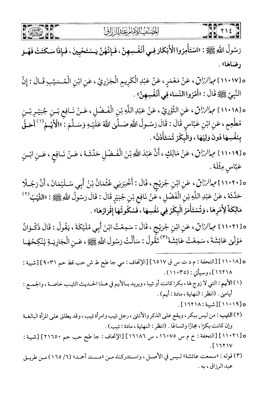 11017- عبد الرزاق، عَنْ مَعْمَرٍ، عَنْ عَبدِ الْكَرِيمِ الْجَزَرِيِّ، عَنِ ابْنِ المُسَيَّبِ، قَالَ: إِنَّ النَّبِيَّ صَلَّى اللهُ عَلَيْهِ وَسَلَّمَ قَالَ: أَمِّرُوا النِّسَاءَ فِي أَنْفُسِهِنَّ.