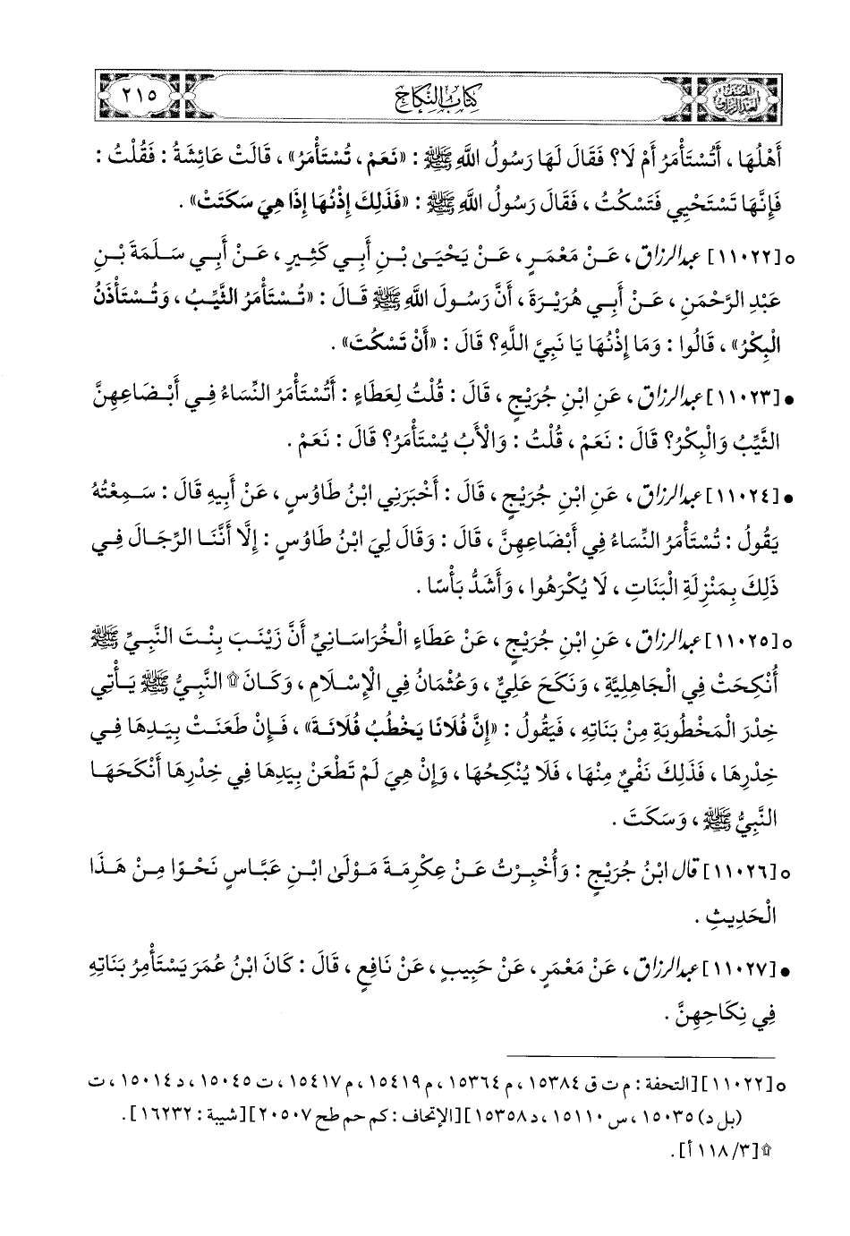 11027- عبد الرزاق، عَنْ مَعْمَرٍ، عَن حَبِيبٍ، عَن نَافِعٍ، قَالَ: كَانَ ابْنُ عُمَرَ يَسْتَأْمِرُ بَنَاتِهِ فِي نِكَاحِهِنَّ.