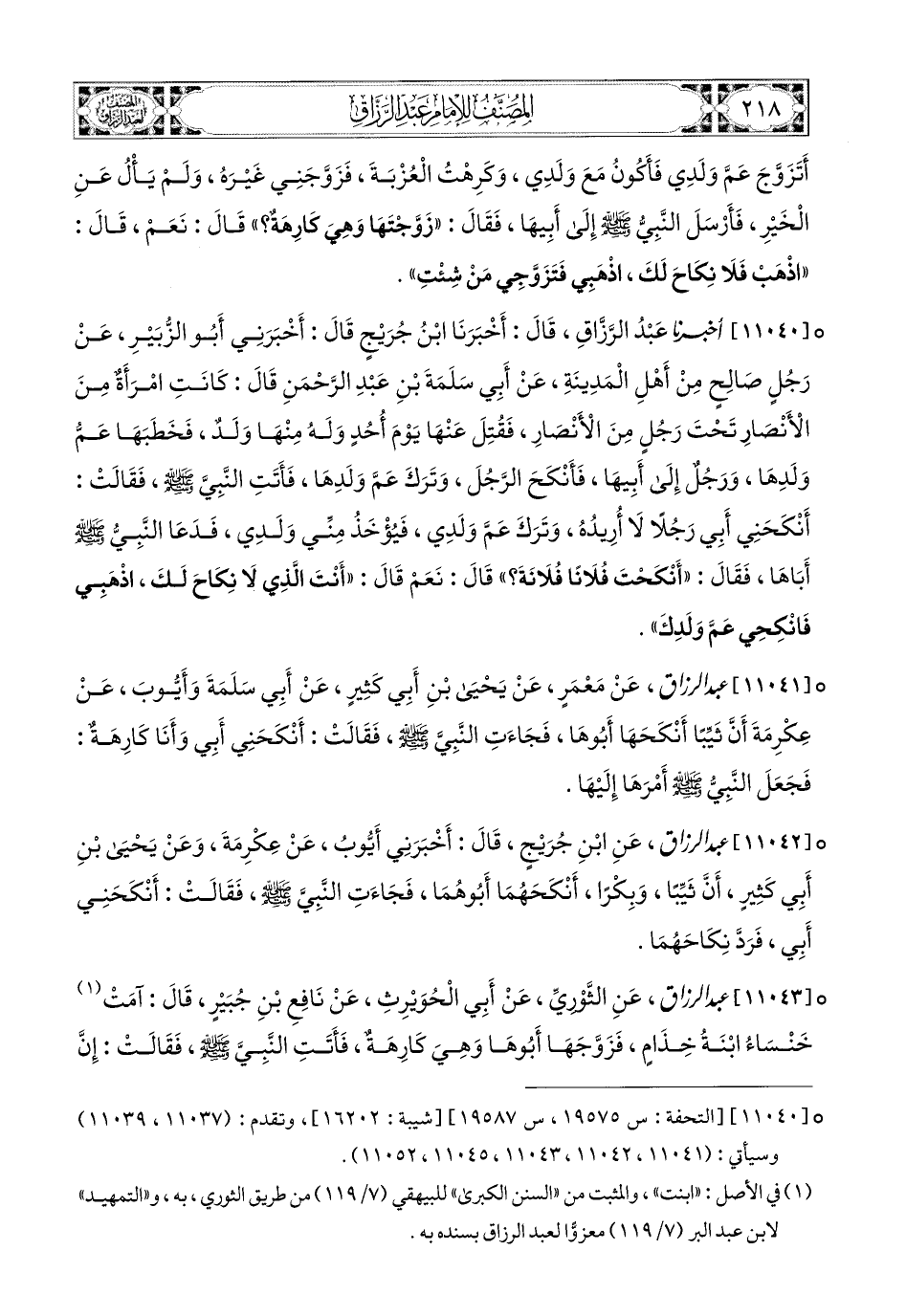 11040- أخبرنا عبد الرزاق، قال: أَخْبَرَنَا ابْنُ جُرَيْجٍ، قَالَ: أَخْبَرَنِي أَبو الزُّبَيْرِ، عَن رَجُلٍ صَالِحٍ مِنْ أَهْلِ المَدِينَةِ، عَنْ أَبِي سَلَمَةَ بْنِ عَبدِ الرَّحْمَنِ، قَالَ: كَانَتِ امْرَأَةٌ مِنَ الأَنْصَارِ تَحْتَ رَجُلٍ مِنَ الأَنْصَارِ، فَقُتِلَ عَنْهَا يَوْمَ أُحُدٍ، وَلَهُ مِنْهَا وَلَدٌ، فَخَطَبَهَا عَمُّ وَلَدِهَا، وَرَجُلٌ إِلَى أَبِيهَا، فَأَنْكَحَ الرَّجُلَ، وَتَرَكَ عَمَّ وَلَدِهَا، فَأَتَتِ النَّبِيَّ صَلَّى اللهُ عَلَيْهِ وَسَلَّمَ، فَقَالَتْ: أَنْكَحَنِي أَبِي رَجُلاً لاَ أُرِيدُهُ، وَتَرَكَ عَمَّ وَلَدِي، فَيُؤْخَذُ مِنِّي وَلَدِي، فَدَعَا النَّبِيُّ صَلَّى اللهُ عَلَيْهِ وَسَلَّمَ أَبَاهَا، فَقَالَ: أَنْكَحْتَ فُلاَنًا فُلاَنَةَ؟ قَالَ: نَعَمْ، قَالَ: أَنْتَ الَّذِي لاَ نِكَاحَ لَكَ، اذْهَبِي فَانْكِحِي عَمَّ وَلَدِكِ.