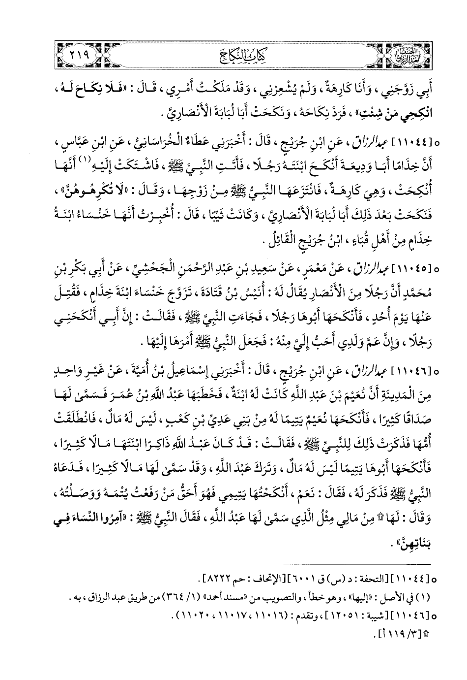 11046 - عبد الرزاق، عَنِ ابْنِ جُرَيْجٍ، قَالَ: أَخْبَرَنِي إِسْمَاعِيلُ بن أُمَيَّةَ، عَن غَيْرِ وَاحِدٍ مِنَ المَدِينَةِ؛ أَنَّ نُعَيْمَ بن عَبدِ اللهِ كَانَتْ لَهُ ابْنَةٌ، فَخَطَبَهَا عَبدُ اللهِ بن عُمَرَ، فَسَمَّى لَهَا صَدَاقًا كَثِيرًا، فَأَنْكَحَهَا نُعَيْمٌ يَتِيمًا لَهُ مِنْ بَنِي عَدِي بنِ كَعْبٍ، لَيْسَ لَهُ مَالٌ، فَانْطَلَقَتْ أُمُّهَا، فَذَكَرَتْ ذَلِكَ لِلنَّبِيِّ صَلَّى اللهُ عَلَيْهِ وَسَلَّمَ، فَقَالَتْ: قَدْ كَانَ عَبدُ اللهِ ذَاكِرًا ابْنَتَهَا مَالاً كَثِيرًا (1)، فَأَنْكَحَهَا أَبوهَا يَتِيمًا، لَيْسَ لَهُ مَالٌ، وَتَرَكَ عَبدَ اللهِ، وَقَدْ سَمَّى لَهَا مَالاً كَثِيرًا، فَدَعَاهُ النَّبِيُّ صَلَّى اللهُ عَلَيْهِ وَسَلَّمَ، فَذَكَرَ لَهُ، فَقَالَ: نَعَمْ، أَنْكَحْتُهَا يَتِيمِي، فَهُوَ أَحَقُّ مَنْ رَفَعْتُ يُتْمَهُ وَوَصَلْتُهُ، وَقَالَ: لَهَا مِنْ مَالِي مِثْلَ الَّذِي سَمَّى لَهَا عَبدُ اللهِ، فَقَالَ النَّبِيُّ صَلَّى اللهُ عَلَيْهِ وَسَلَّمَ: آمِرُوا النِّسَاءَ فِي بَنَاتِهِنَّ.