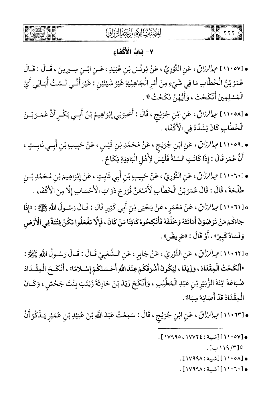 11060- عبد الرزاق، عَنِ الثَّورِيِّ، عَن حَبِيبِ بْنِ أَبِي ثَابِتٍ، عَن إِبرَاهِيمَ بْنِ مُحَمَّدِ بْنِ طَلْحَةَ قَالَ: قَالَ عُمَرُ بن الْخَطَّابِ: لأَمْنَعَنَّ فُرُوجَ ذَوَاتِ الأَحْسَابِ إِلاَّ مِنَ الأَكْفَاءِ.