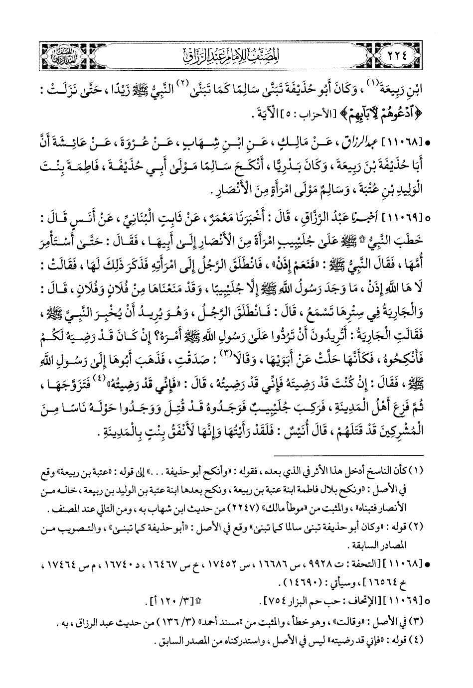 11069 - أخبرنا عبد الرزاق، قال: أَخْبَرَنَا مَعْمَرٌ، عَن ثَابِتٍ الْبُنَانِيِّ، عَنْ أَنَسٍ قَالَ: خَطَبَ النَّبِيُّ صَلَّى اللهُ عَلَيْهِ وَسَلَّمَ عَلَى جُلَيْبِيبٍ امْرَأَةً مِنَ الأَنْصَارِ إِلَى أَبِيهَا، فَقَالَ: حَتَّى أَسْتَأْمِرُ أُمَّهَا، فَقَالَ النَّبِيُّ صَلَّى اللهُ عَلَيْهِ وَسَلَّمَ: فَنَعَمْ إِذًا، فَانْطَلَقَ الرَّجُلُ إِلَى امْرَأَتِهِ، فَذَكَرَ ذَلِكَ لَهَا، فَقَالَتْ: لاَهَا اللهِ إِذًا، مَا وَجَدَ رَسُولُ اللهِ صَلَّى اللهُ عَلَيْهِ وَسَلَّمَ إِلاَّ جُلَيْبِيبًا، وَقَدْ مَنَعْنَاهَا مِنْ فُلاَنٍ وَفُلاَنٍ، قَالَ: وَالْجَارِيَةُ فِي سِتْرِهَا تَسْمَعُ، قَالَ: فَانْطَلَقَ الرَّجُلُ، وَهُوَ يُرِيدُ أَنْ يُخْبِرَ النَّبِيَّ صَلَّى اللهُ عَلَيْهِ وَسَلَّمَ، فَقَالَتِ الْجَارِيَةُ: أَتُرِيدُونَ أَنْ تَرُدُّوا عَلَى رَسُولِ اللهِ صَلَّى اللهُ عَلَيْهِ وَسَلَّمَ أَمْرَهُ؟ إِنْ كَانَ قَدْ رَضِيَهُ لَكُمْ، فَأَنْكِحُوهُ، فَكَأَنَّهَا حَلَّتْ عَنْ أَبَوَيْهَا، وَقَالاَ (1): صَدَقْتِ، فَذَهَبَ أَبوهَا إِلَى رَسُولِ اللهِ صَلَّى اللهُ عَلَيْهِ وَسَلَّمَ، فَقَالَ: إِنْ كُنْتَ قَدْ رَضِيتَهُ، فقد رضيناه، قَالَ: فَإِنِّي قَدْ رَضِيتُهُ (2)، فَتَزَوَّجَهَا، ثُمَّ فَزِعَ أَهْلُ المَدِينَةِ، فَرَكِبَ جُلَيْبِيبٌ، فَوَجَدُوهُ قَدْ قُتِلَ، وَوَجَدُوا حَوْلَهُ نَاسًا مِنَ المُشْرِكِينَ قَدْ قَتَلَهُمْ، قَالَ أنس (3): فَلَقَدْ رَأَيْتُهَا وَإِنَّهَا لأَنْفَقُ بَيْتٍ (4) بِالمَدِينَةِ.