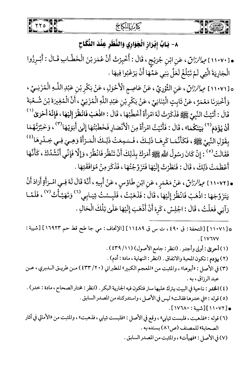 11071 - عبد الرزاق، عَنِ الثَّورِيِّ، عَنْ عَاصِمٍ الأَحْوَلِ، عَن بَكْرِ بْنِ عَبدِ اللهِ المُزَنِيِّ، وَأَخْبَرَنَا مَعْمَرٌ، عَن ثَابِتٍ الْبُنَانِيِّ، عَن بَكْرِ بْنِ عَبدِ اللهِ المُزَنِيِّ، أَنَّ المُغِيرَةَ بن شُعْبَةَ قَالَ: أَتَيْتُ النَّبِيَّ صَلَّى اللهُ عَلَيْهِ وَسَلَّمَ، فَذَكَرْتُ لَهُ امْرَأَةً أَخْطُبُهَا، قَالَ: اذْهَبْ فَانْظُرْ إِلَيْهَا، فَإِنَّهُ أَحْرَى أَنْ يُؤْدَمَ بَيْنَكُمَا، قَالَ: فَأَتَيْتُ امْرَأَةً مِنَ الأَنْصَارِ، فَخَطَبْتُهَا إِلَى أَبَوَيْهَا، وَخَبَّرْتُهُمَا بِقَوْلِ النَّبِيِّ صَلَّى اللهُ عَلَيْهِ وَسَلَّمَ، فَكَأَنَّمَا كَرِهَا ذَلِكَ، فَسَمِعت ذَلِكَ المَرْأَةَ وَهِيَ فِي خدرها، فَقَالَتْ (1): إِنْ كَانَ رَسُولُ اللهِ صَلَّى اللهُ عَلَيْهِ وَسَلَّمَ أَمَرَكَ بِذَلِكَ أَنْ تَنْظُرَ فَانْظُرْ، وَإِلاَّ فَإِنِّي أَنْشُدُكَ، كَأَنَّهَا أَعْظَمَتْ ذَلِكَ، قَالَ: فَنَظَرْتُ إِلَيْهَا، فَتَزَوَّجْتُهَا، فَذَكَرَ مِنْ مُوافَقَتِهَا.