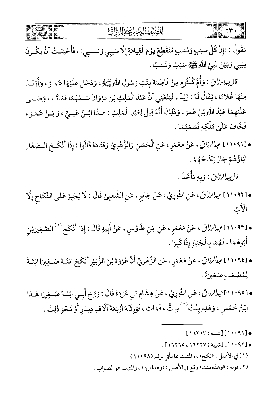 11094- عبد الرزاق، عَنْ مَعْمَرٍ، عَنِ الزُّهْرِيِّ؛ أَنَّ عُرْوَةَ بن الزُّبَيْرِ أَنْكَحَ ابْنَهُ صَغِيرًا ابْنَةً لِمُصَعْبٍ صَغِيرَةً.