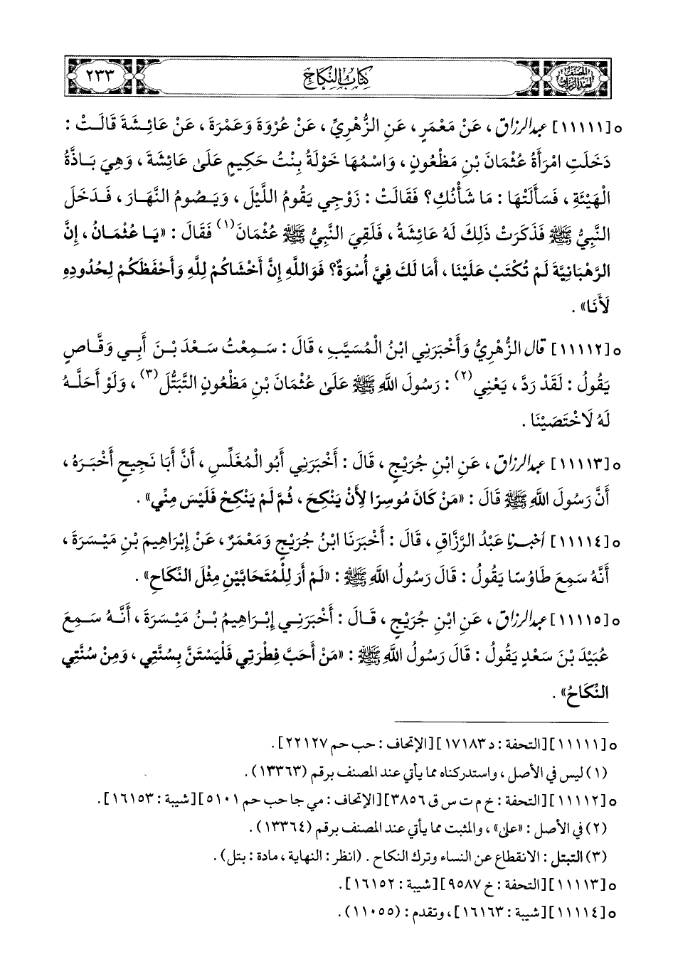 11111 - عبد الرزاق، عَنْ مَعْمَرٍ، عَنِ الزُّهْرِيِّ، عَن عُرْوَةَ، وَعَمْرَةَ، عَنْ عَائِشَةَ، قَالَتْ: دَخَلَتِ امْرَأَةُ عُثْمَانَ بْنِ مَظْعُونٍ، واسْمُهَا: خَوْلَةُ بِنْتُ حَكِيمٍ عَلَى عَائِشَةَ، وَهِيَ بَاذَّةُ الْهَيْئَةِ، فَسَأَلَتْهَا: مَا شَأْنُكِ؟ فَقَالَتْ: زَوْجِي يَقُومُ اللَّيْلَ، وَيَصُومُ النَّهَارَ، فَدَخَلَ النَّبِيُّ صَلَّى اللهُ عَلَيْهِ وَسَلَّمَ، فَذَكَرَتْ ذَلِكَ لَهُ عَائِشَةُ، فَلَقِيَ النَّبِيُّ صَلَّى اللهُ عَلَيْهِ وَسَلَّمَ [عُثْمَان] (1)، فَقَالَ: يَا عُثْمَانُ، إِنَّ الرَّهْبَانِيَّةَ لَمْ تُكْتَبْ عَلَيْنَا، أَمَا لَكَ فِيَّ أُسْوَةٌ؟ فَوَاللهِ إِنَّ أَخْشَاكُمْ للهِ وَأَحْفَظَكُمْ لِحُدُودِهِ لأَنَا.