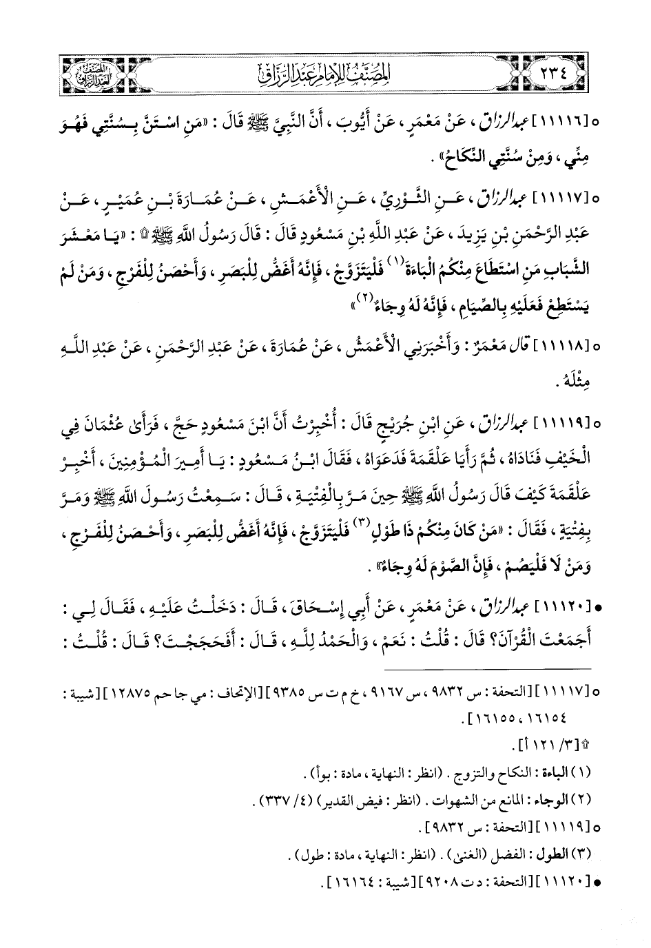 11119- عبد الرزاق، عَنِ ابْنِ جُرَيْجٍ، قَالَ: أُخْبِرْتُ أَنَّ ابْنَ مَسْعُودٍ حَجَّ، فَرَأَى عُثْمَانَ فِي الْخَيْفِ، فَنَادَاهُ، ثُمَّ رَأَيَا عَلْقَمَةَ، فَدَعَوَاهُ، فَقَالَ ابْنُ مَسْعُودٍ: يَا أَمِيرَ المُؤْمِنِينَ، أَخْبِرْ عَلْقَمَةَ كَيْفَ قَالَ رَسُولُ اللهِ صَلَّى اللهُ عَلَيْهِ وَسَلَّمَ حِينَ مَرَّ بِالْفِتْيَةِ؟ قَالَ: سَمِعْتُ رَسُولَ اللهِ صَلَّى اللهُ عَلَيْهِ وَسَلَّمَ وَمَرَّ بِفِتْيَةٍ، فَقَالَ: مَنْ كَانَ مِنْكُمْ ذَا طَوْلٍ، فَلْيَتَزَوَّجْ، فَإِنَّهُ أَغَضُّ لِلْبَصَرِ، وَأَحْصَنُ لِلْفَرْجِ، وَمَنْ لاَ فَلْيَصُمْ، فَإِنَّ الصَّوْمَ لَهُ وِجَاءٌ.