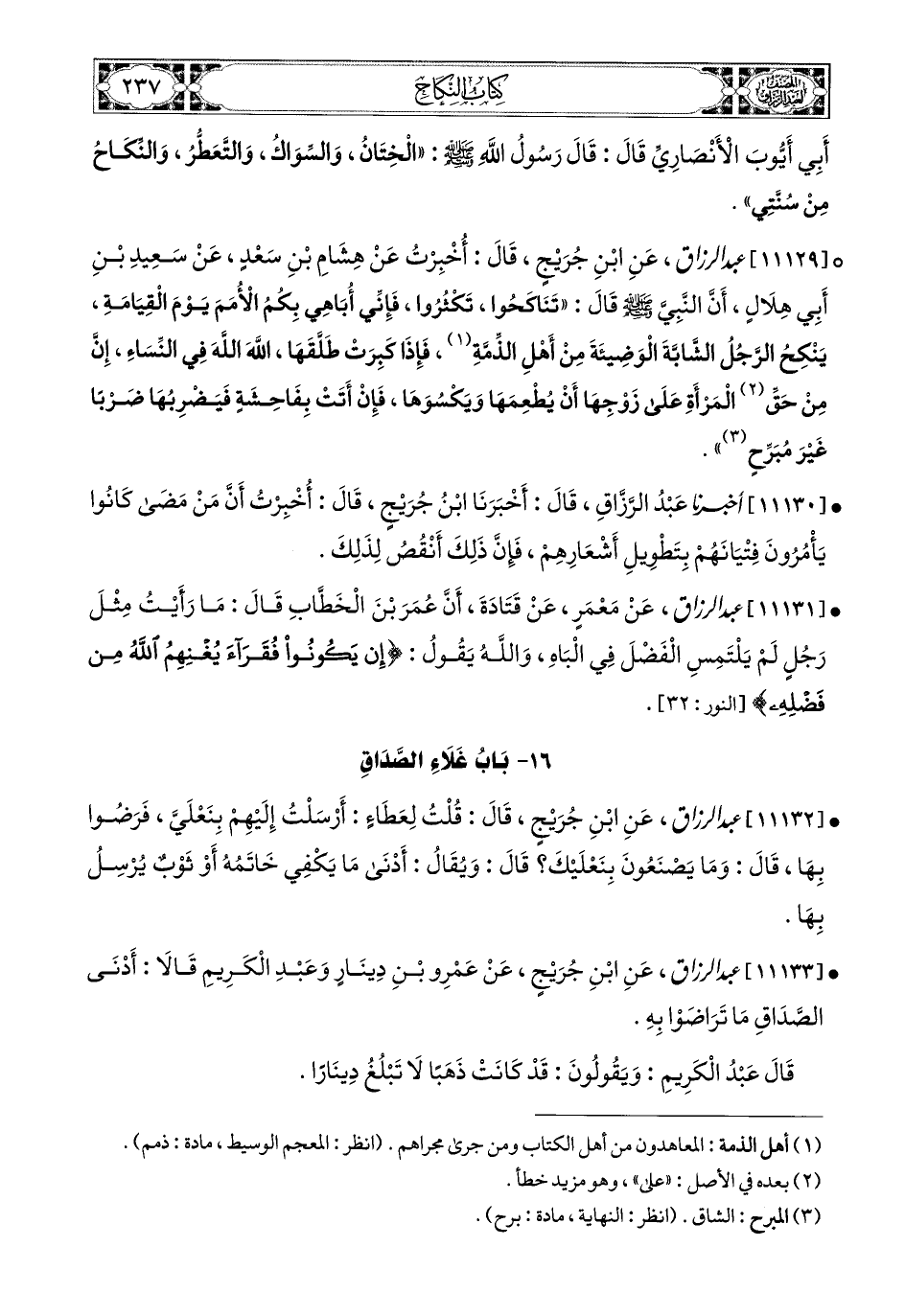 11129- عبد الرزاق، عَنِ ابْنِ جُرَيْجٍ، قَالَ: أُخْبِرْتُ عَن هِشَامِ بْنِ سَعْدٍ، عَن سَعيدِ بْنِ أَبِي هِلاَلٍ؛ أَنَّ النَّبِيَّ صَلَّى اللهُ عَلَيْهِ وَسَلَّمَ قَالَ: تَنَاكَحُوا، تَكْثُرُوا، فَإِنِّي أُبَاهِي بِكُمُ الأُمَمَ يَوْمَ الْقِيَامَةِ، يَنْكِحُ الرَّجُلُ الشَّابَّةَ الْوَضِيئَةَ مِنْ أَهْلِ الذِّمَّةِ، فَإِذَا كَبِرَتْ طَلَّقَهَا، اللهَ اللهَ فِي النِّسَاءِ، إِنَّ مِنْ حَقِّ المَرْأَةِ عَلَى زَوْجِهَا أَنْ يُطْعِمَهَا، وَيَكْسُوَهَا، فَإِنْ أَتَتْ بِفَاحِشَةٍ فيَضْرِبُهَا ضَرْبًا غَيْرَ مُبَرِّحٍ.