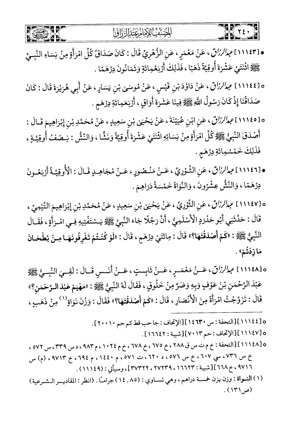 11143- عبد الرزاق، عَنْ مَعْمَرٍ، عَنِ الزُّهْرِيِّ، قَالَ: كَانَ صَدَاقُ كُلِّ امْرَأَةٍ مِنْ نِسَاءِ النَّبِيِّ صَلَّى اللهُ عَلَيْهِ وَسَلَّمَ اثْنَتَيْ عَشْرَةَ أُوقِيَّةً ذَهَبًا، فَذَلِكَ أَرْبَعُ مِئَةٍ وَثَمَانُونَ دِرْهَمًا.