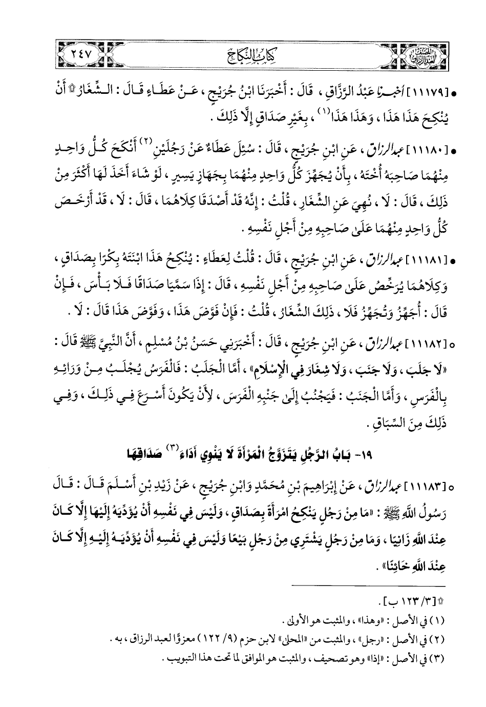 11183- عبد الرزاق، عَن إِبرَاهِيمَ بْنِ مُحَمَّدٍ، وَابْنِ جُرَيْجٍ، عَن زَيْدِ بْنِ أَسْلَمَ قَالَ: قَالَ رَسُولُ اللهِ صَلَّى اللهُ عَلَيْهِ وَسَلَّمَ: مَا مِنْ رَجُلٍ يَنْكِحُ امْرَأَةً بِصَدَاقٍ، وَلَيْسَ فِي نَفْسِهِ أَنْ يُؤَدِّيَهُ إِلَيْهَا، إِلاَّ كَانَ عِنْدَ اللهِ زَانِيًا، وَمَا مِنْ رَجُلٍ يَشْتَرِي مِنْ رَجُلٍ بَيْعًا، وَلَيْسَ فِي نَفْسِهِ أَنْ يُؤَدِّيَهُ إِلَيْهِ، إِلاَّ كَانَ عِنْدَ اللهِ خَائِنًا.
