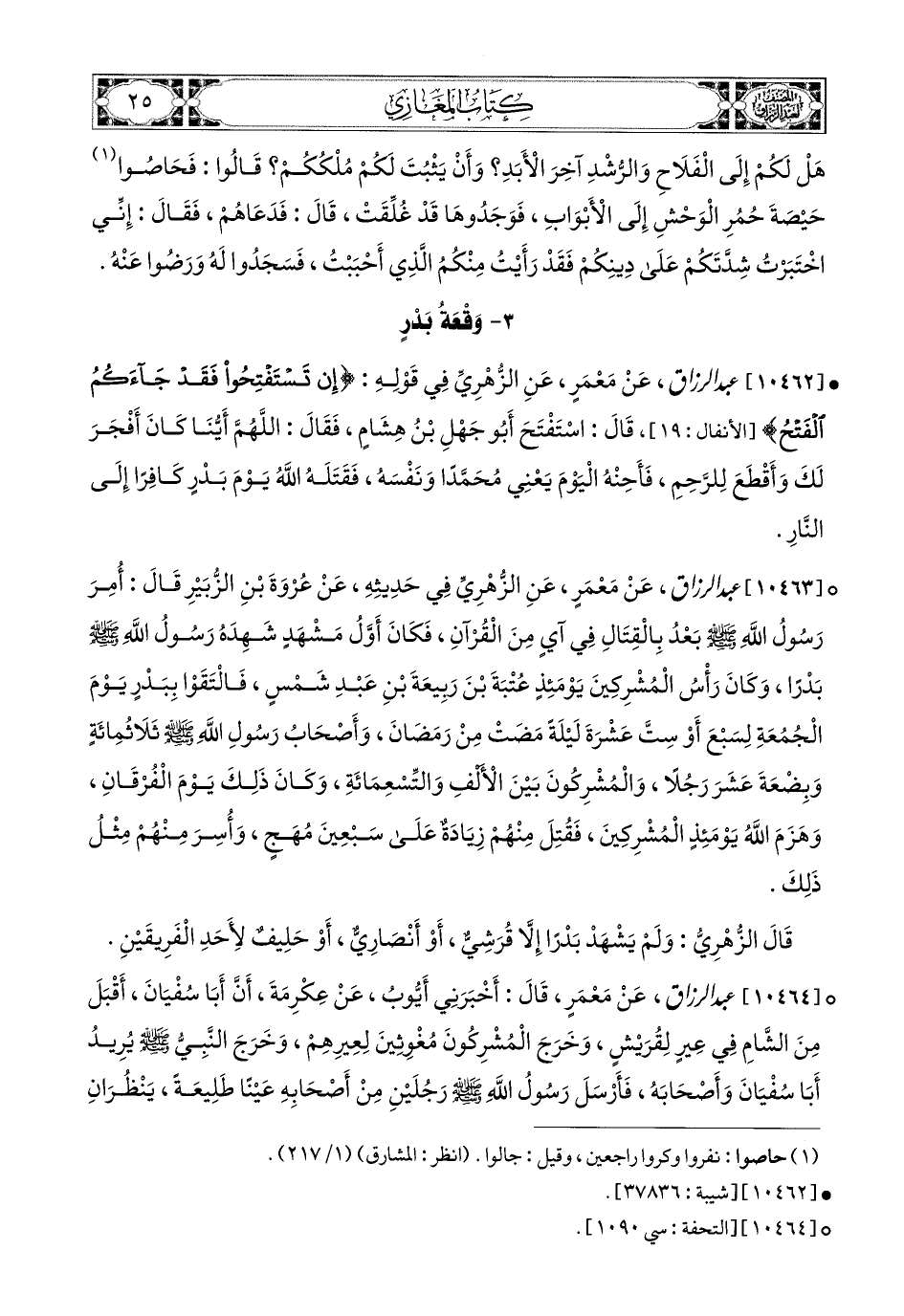 10463- عبد الرزاق، عَنْ مَعْمَرٍ، عَنِ الزُّهْرِيِّ فِي حَدِيثِهِ، عَن عُرْوَةَ بْنِ الزُّبَيْرِ قَالَ: أُمِرَ رَسُولُ اللهِ صَلَّى اللهُ عَلَيْهِ وَسَلَّمَ بَعْدُ بِالْقِتَالِ فِي آيٍ مِنَ الْقُرْآنِ، فَكَانَ أَوَّلُ مَشْهَدٍ شَهِدَهُ رَسُولُ اللهِ صَلَّى اللهُ عَلَيْهِ وَسَلَّمَ بَدْرًا، وَكَانَ رَأْسُ المُشْرِكِينَ يَوْمَئِذٍ عُتْبَةُ بن رَبِيعَةَ بْنِ عَبدِ شَمْسٍ، فَالْتَقَوْا بِبَدْرٍ يَوْمَ الْجُمُعَةِ لِسَبْعَ، أَوْ سِتَّ عَشْرَةَ لَيْلَةً مَضَتْ مِنْ رَمَضَانَ، وَأَصْحَابُ رَسُولِ اللهِ صَلَّى اللهُ عَلَيْهِ وَسَلَّمَ ثَلاَثُ مِئَةٍ وَبِضْعَةَ عَشَرَ رَجُلاً، وَالمُشْرِكُونَ بَيْنَ الأَلْفِ وَالتِّسْعِ مِئَةٍ، وَكَانَ ذَلِكَ يَوْمُ الْفُرْقَانِ، وَهَزَمَ اللهُ يَوْمَئِذٍ المُشْرِكِينَ، فَقُتِلَ مِنْهُمْ زِيَادَةٌ عَلَى سَبْعِينَ مُهَجٍ، وَأُسِرَ مِنْهُمْ مِثْلُ ذَلِكَ.