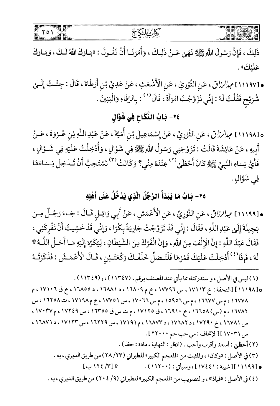 11198- عبد الرزاق، عَنِ الثَّورِيِّ، عَن إِسْمَاعِيلَ بْنِ أُمَيَّةَ، عَنْ عَبدِ اللهِ بْنِ عُرْوَةَ، عَنْ أَبِيهِ، عَنْ عَائِشَةَ، قَالَتْ: تَزَوَّجَنِي رَسُولُ اللهِ صَلَّى اللهُ عَلَيْهِ وَسَلَّمَ فِي شَوَّالٍ، وَأُدخِلْتُ عَلَيْهِ فِي شَوَّالٍ، فَأَيُّ نِسَاءِ النَّبِيِّ صَلَّى اللهُ عَلَيْهِ وَسَلَّمَ كَانَ أَحْظَى عِنْدَهُ مِنِّي؟ وَكَانَتْ تَستَحِبُّ أَنْ تُدْخِلَ نِسَاءَهَا فِي شَوَّالٍ.