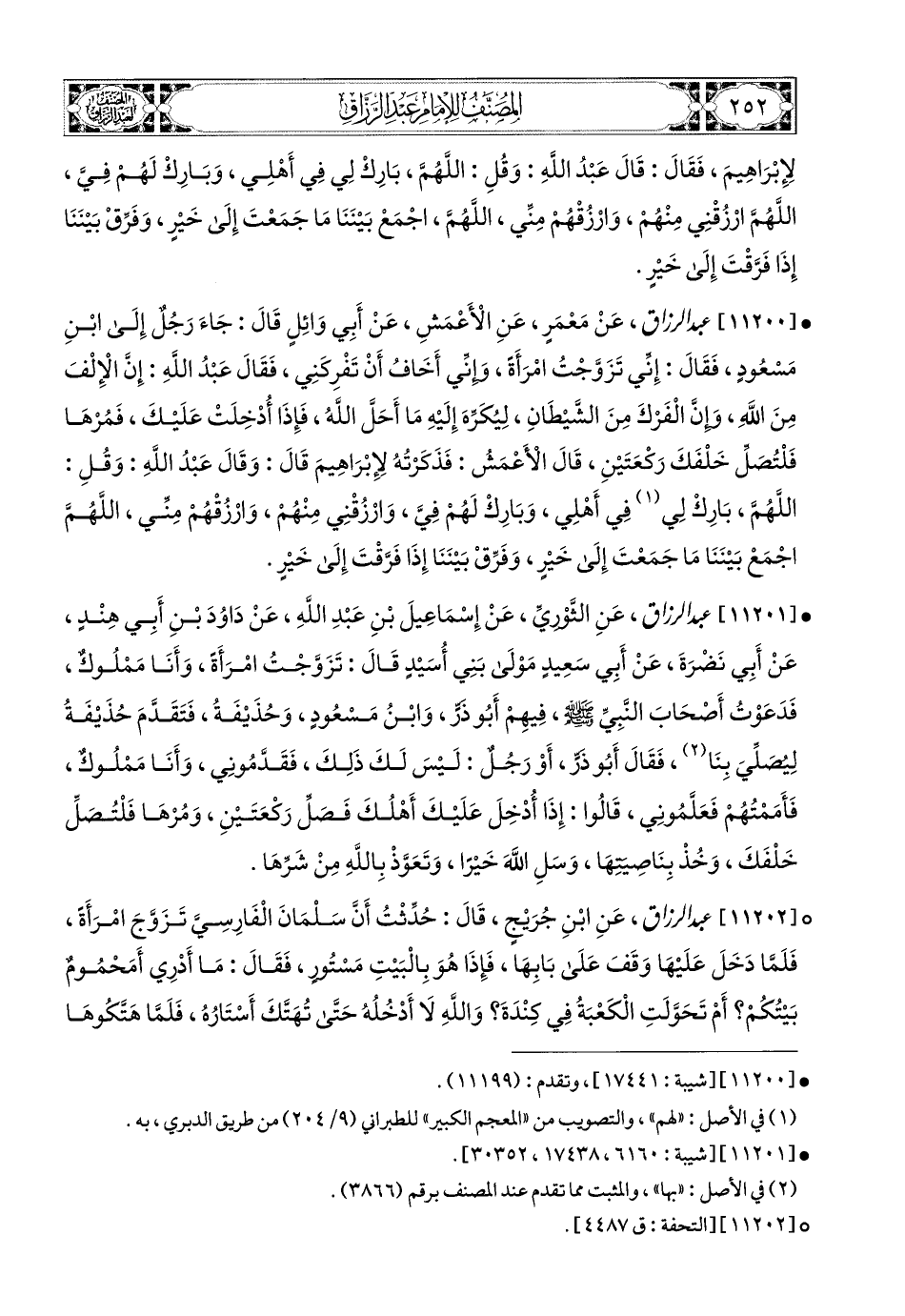 11200- عبد الرزاق، عَنْ مَعْمَرٍ، عَنِ الأَعمَشِ، عَنْ أَبِي وَائِلٍ، قَالَ: جَاءَ رَجُلٌ إِلَى ابْنِ مَسْعُودٍ، فَقَالَ: إِنِّي تَزَوَّجْتُ امْرَأَةً، وَإِنِّي أَخَافُ أَنْ تَفْرِكَنِي، فَقَالَ عَبدُ اللهِ: إِنَّ الإِلْفَ مِنَ اللهِ، وَإِنَّ الْفَرْكَ مِنَ الشَّيْطَانِ، لِيُكَرِّهَ إِلَيْهِ مَا أَحَلَّ اللهُ، فَإِذَا أُدْخِلَتْ عَلَيْكَ، فَمُرْهَا، فَلْتُصَلِّ خَلْفَكَ رَكْعَتَيْنِ، قَالَ الأَعمَشُ: فَذَكَرْتُهُ لإِبرَاهِيمِ، قَالَ: وَقَالَ عَبدُ اللهِ: وَقُلِ: اللهُمَّ بَارِكْ لِي فِي أَهْلِي، وَبَارِكْ لَهُمْ فِيَّ، وَارْزُقْنِي مِنْهُمْ، وَارْزُقْهُمْ مِنِّي، اللهُمَّ اجْمَعْ بَيْنَنَا مَا جَمَعْتَ إِلَى خَيْرٍ، وَفَرِّقْ بَيْنَنَا إِذَا فَرَّقْتَ إِلَى خَيْرٍ.