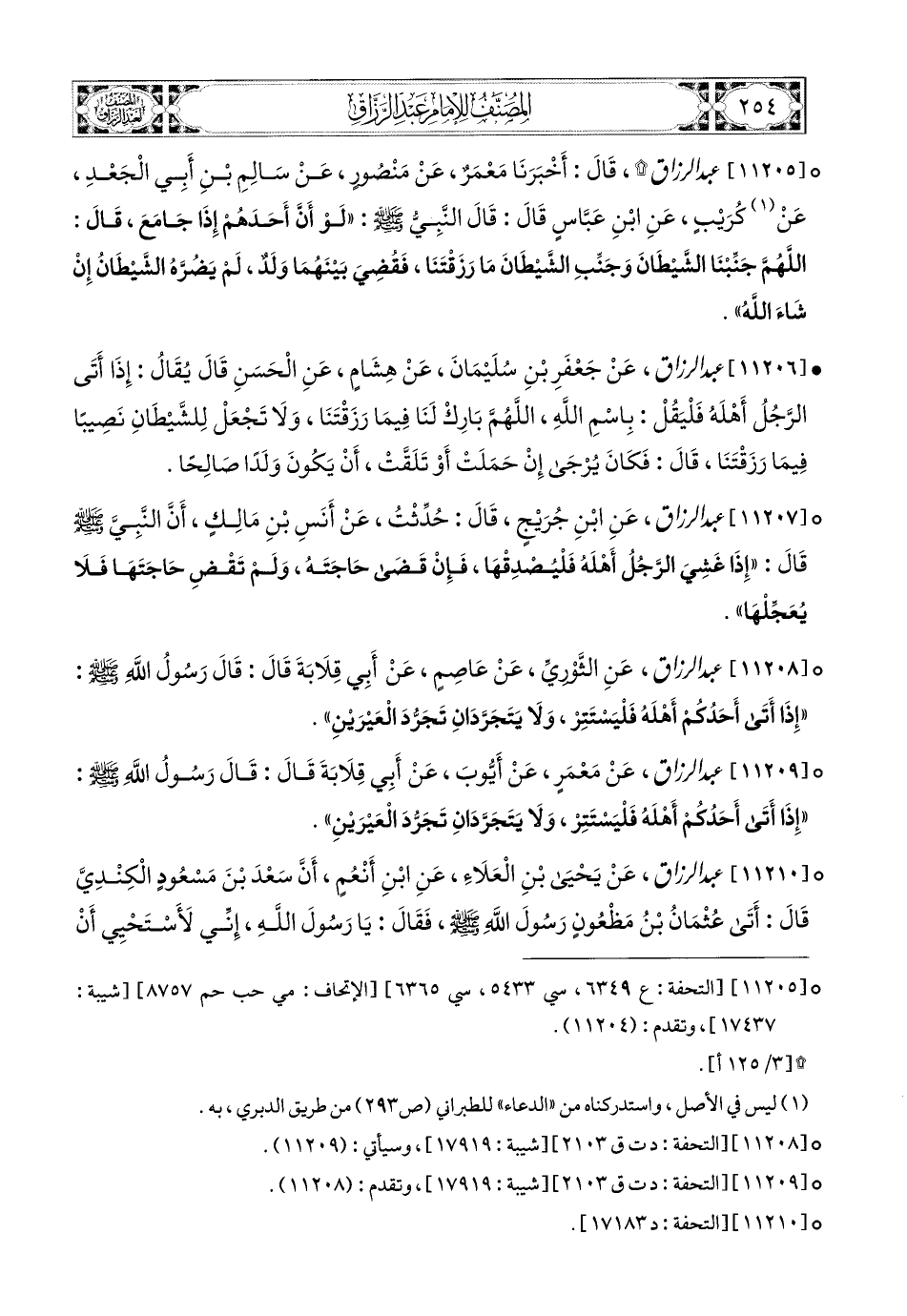 11205- عبد الرزاق، قال: أَخْبَرَنَا مَعْمَرٌ، عَنْ مَنصُورٍ، عَن سَالِمِ بْنِ أَبِي الْجَعْدِ، عَن كُرَيْبٍ، عَنِ ابْنِ عَبَّاسٍ، قَالَ: قَالَ النَّبِيُّ صَلَّى اللهُ عَلَيْهِ وَسَلَّمَ: لَوْ أَنَّ أَحَدَهُمْ إِذَا جَامَعَ قَالَ: اللهُمَّ جَنِّبْنَا الشَّيْطَانَ، وَجَنِّبِ الشَّيْطَانَ مَا رَزَقْتَنَا، فَقُضِيَ بَيْنَهُمَا وَلَدٌ، لَمْ يَضُرَّهُ الشَّيْطَانُ إِنْ شَاءَ اللهُ.