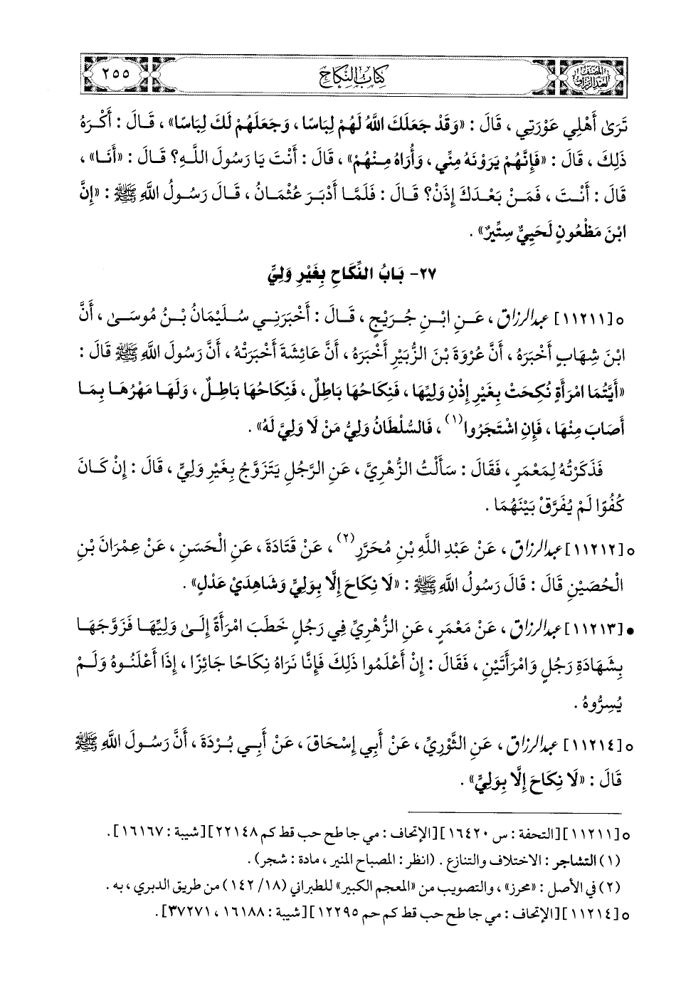 11212- عبد الرزاق، عَنْ عَبدِ اللهِ بْنِ مُحَرَّرٍ، عَن قَتَادَةَ، عَنِ الْحَسَنِ، عَنْ عِمْرَانَ بْنِ الْحُصَيْنِ، قَالَ: قَالَ رَسُولُ اللهِ صَلَّى اللهُ عَلَيْهِ وَسَلَّمَ: لاَ نِكَاحَ إِلاَّ بِوَلِيٍّ وَشَاهِدَيْ عَدْلٍ.