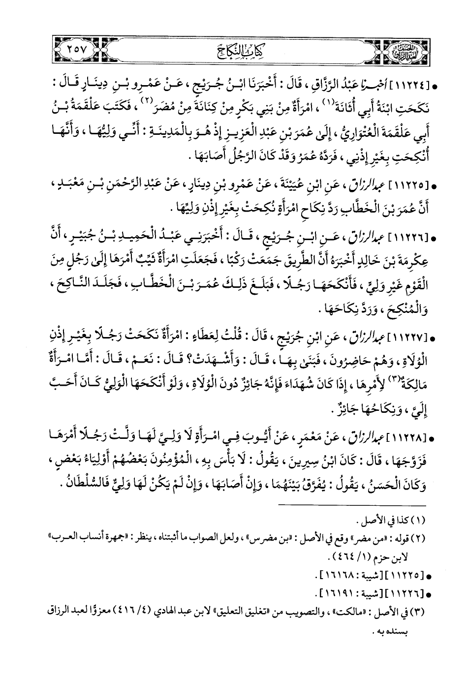 11225- عبد الرزاق، عَنِ ابْنِ عُيَيْنَةَ، عَنْ عَمْرِو بنِ دِينَارٍ، عَنْ عَبدِ الرَّحْمَنِ بْنِ مَعْبَدٍ، أَنَّ عُمَرَ بن الْخَطَّابِ رَدَّ نِكَاحَ امْرَأَةٍ نَكَحَتْ بِغَيْرِ إِذْنِ وَلِيِّهَا.