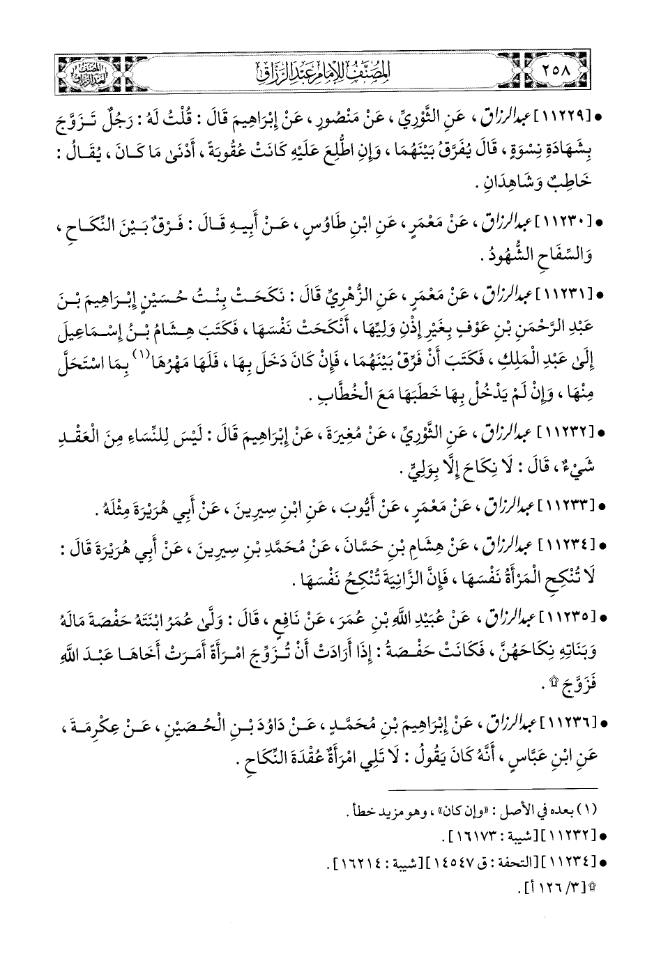 11230- عبد الرزاق، عَنْ مَعْمَرٍ، عَنِ ابْنِ طَاوُوسٍ، عَنْ أَبِيهِ، قَالَ: فَرْقٌ بَيْنَ النِّكَاحِ وَالسِّفَاحِ الشُّهُودُ.