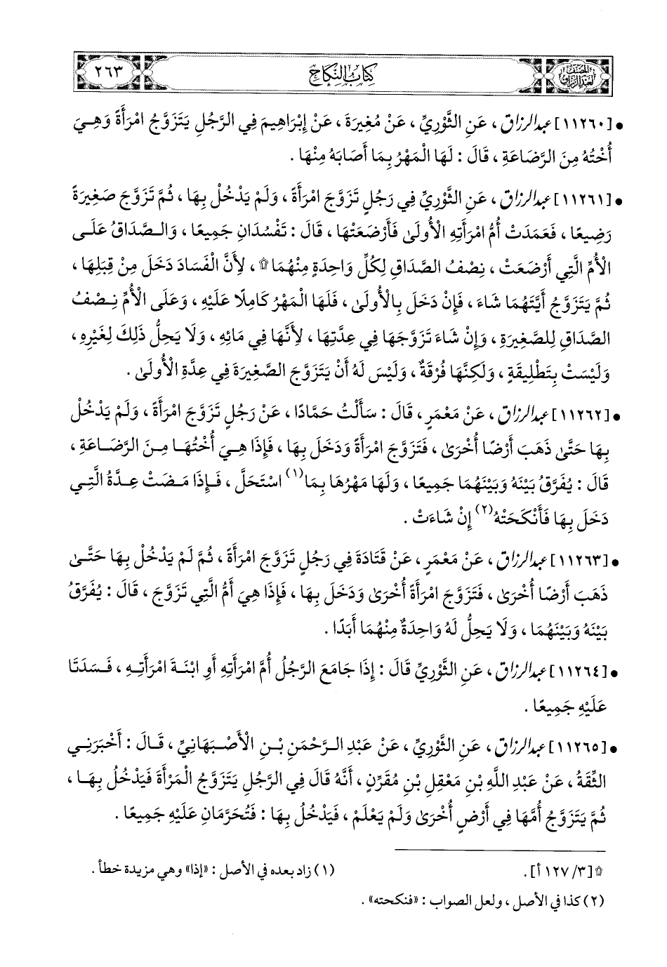 11265 - عبد الرزاق، عَنِ الثَّورِيِّ، عَنْ عَبدِ الرَّحْمَنِ بْنِ الأَصْبَهَانِيِّ، قَالَ: أَخْبَرَنِي الثِّقَةُ، عَنْ عَبدِ اللهِ بْنِ مَعْقِلِ بْنِ مُقَرِّنٍ، أَنَّهُ قَالَ فِي الرَّجُلِ يَتَزَوَّجُ المَرْأَةَ فَيَدْخُلُ بِهَا، ثُمَّ يَتَزَوَّجُ أُمَّهَا فِي أَرْضٍ أُخْرَى وَلَمْ يَعْلَمْ، فَيَدْخُلُ بِهَا: فَتُحَرَّمَانِ (1) عَلَيْهِ جَمِيعًا.