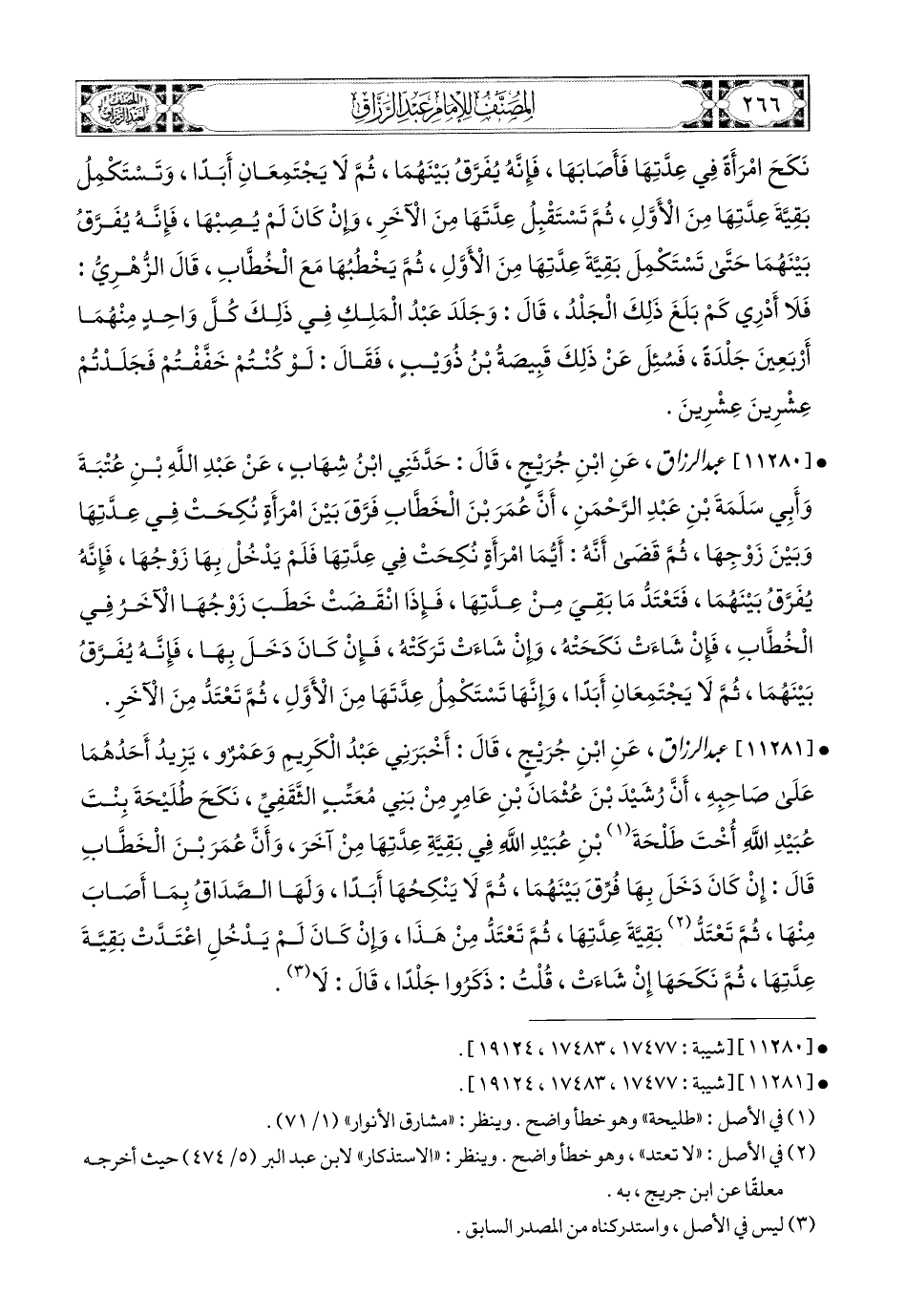 11281- عبد الرزاق، عَنِ ابْنِ جُرَيْجٍ، قَالَ أَخْبَرَنِي عَبدُ الْكَرِيمِ، وَعَمْرٌو، يَزِيدُ أَحَدُهُمَا عَلَى صَاحِبِهِ، أَنَّ رُشَيْدَ بن عُثْمَانَ بْنِ عَامِرٍ، مِنْ بَنِي مُعَتِّبٍ الثَّقَفِيِّ نَكَحَ طُلَيْحَةَ بِنْتَ عُبَيْدِ اللهِ، أُخْتِ طَلْحَةَ بْنِ عُبَيْدِ اللهِ فِي بَقِيَّةِ عِدَّتِهَا مِنْ آخَرَ، وَأَنَّ عُمَرَ بن الْخَطَّابِ قَالَ: إِنْ كَانَ دَخَلَ بِهَا فُرِّقَ بَيْنَهُمَا، ثُمَّ لاَ يَنْكِحُهَا أَبَدًا، وَلَهَا الصَّدَاقُ بِمَا أَصَابَ مِنْهَا، ثُمَّ تَعْتَدُّ بَقِيَّةَ عِدَّتِهَا، ثُمَّ تَعْتَدُّ مِنْ هَذَا، وَإِنْ كَانَ لَمْ يَدْخُلِ اعْتَدَّتْ بَقِيَّةَ عِدَّتِهَا، ثُمَّ نَكَحَهَا إِنْ شَاءَتْ، قُلْتُ: ذَكَرُوا جَلْدًا، قَالَ: لاَ.
