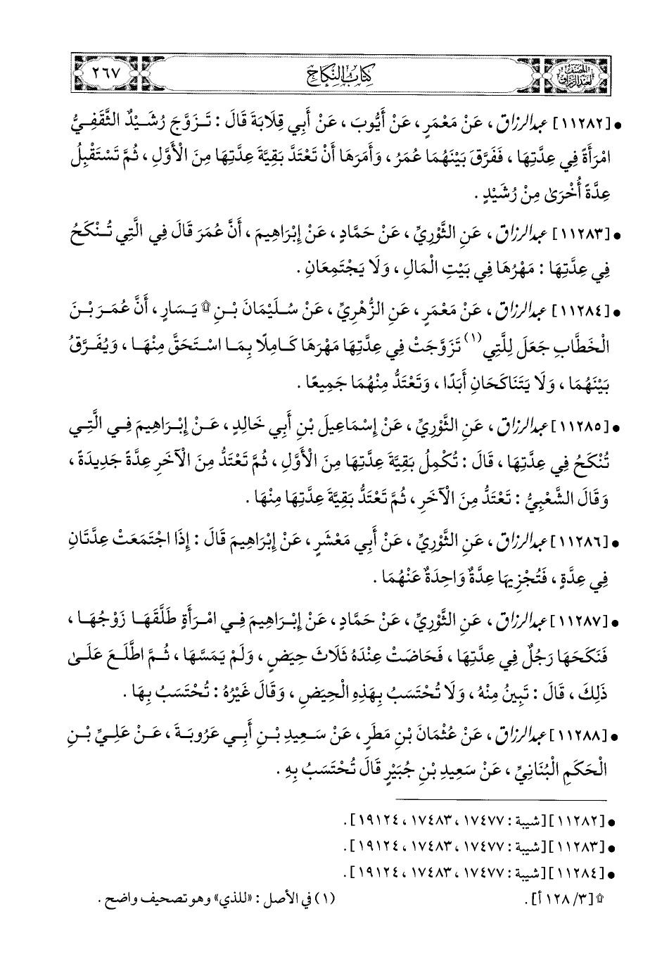 11282- عبد الرزاق، عَنْ مَعْمَرٍ، عَنْ أَيُّوبَ، عَنْ أَبِي قِلاَبَةَ قَالَ: تَزَوَّجَ رُشَيْدٌ الثَّقَفِيُّ امْرَأَةً فِي عِدَّتِهَا، فَفَرَّقَ بَيْنَهُمَا عُمَرُ، وَأَمَرَهَا أَنْ تَعْتَدَّ بَقِيَّةَ عِدَّتِهَا مِنَ الأَوَّلِ، ثُمَّ تَسْتَقْبِلُ عِدَّةً أُخْرَى مِنْ رُشَيْدٍ.