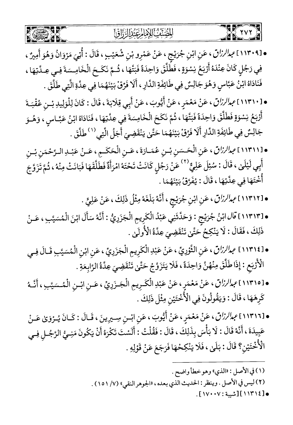 11309- عبد الرزاق، عَنِ ابْنِ جُرَيْجٍ، عَنْ عَمْرِو بنِ شُعَيْبٍ، قَالَ: أُتِيَ مَرْوَانُ وَهُوَ أَمِيرٌ؛ فِي رَجُلٍ كَانَ عِنْدَهُ أَرْبَعُ نِسْوَةٍ، فَطَلَّقَ وَاحِدَةً فَبَتَّهَا، ثُمَّ نَكَحَ الْخَامِسَةَ فِي عِدَّتِهَا، فَنَادَاهُ ابْنُ عَبَّاسٍ وَهُوَ جَالِسٌ فِي طَائِفَةِ الدَّارِ: أَلاَ فَرِّقْ بَيْنَهُمَا فِي عِدَّةِ الَّتِي طَلَّقَ.