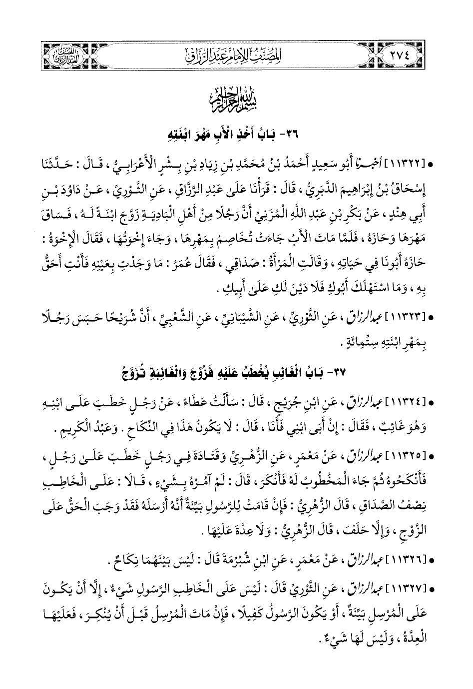 11327- عبد الرزاق، عَنِ الثَّورِيِّ قَالَ: لَيْسَ عَلَى الْخَاطِبِ الرَّسُولِ شَيْءٌ، إِلاَّ أَنْ يَكُونَ عَلَى المُرْسِلِ بَيِّنَةٌ، أَوْ يَكُونَ الرَّسُولُ كَفِيلاً، فَإِنْ مَاتَ المُرْسِلُ قَبْلَ أَنْ يُنْكِرُ، فَعَلَيْهَا الْعِدَّةُ، وَلَيْسَ لَهَا شَيْءٌ.